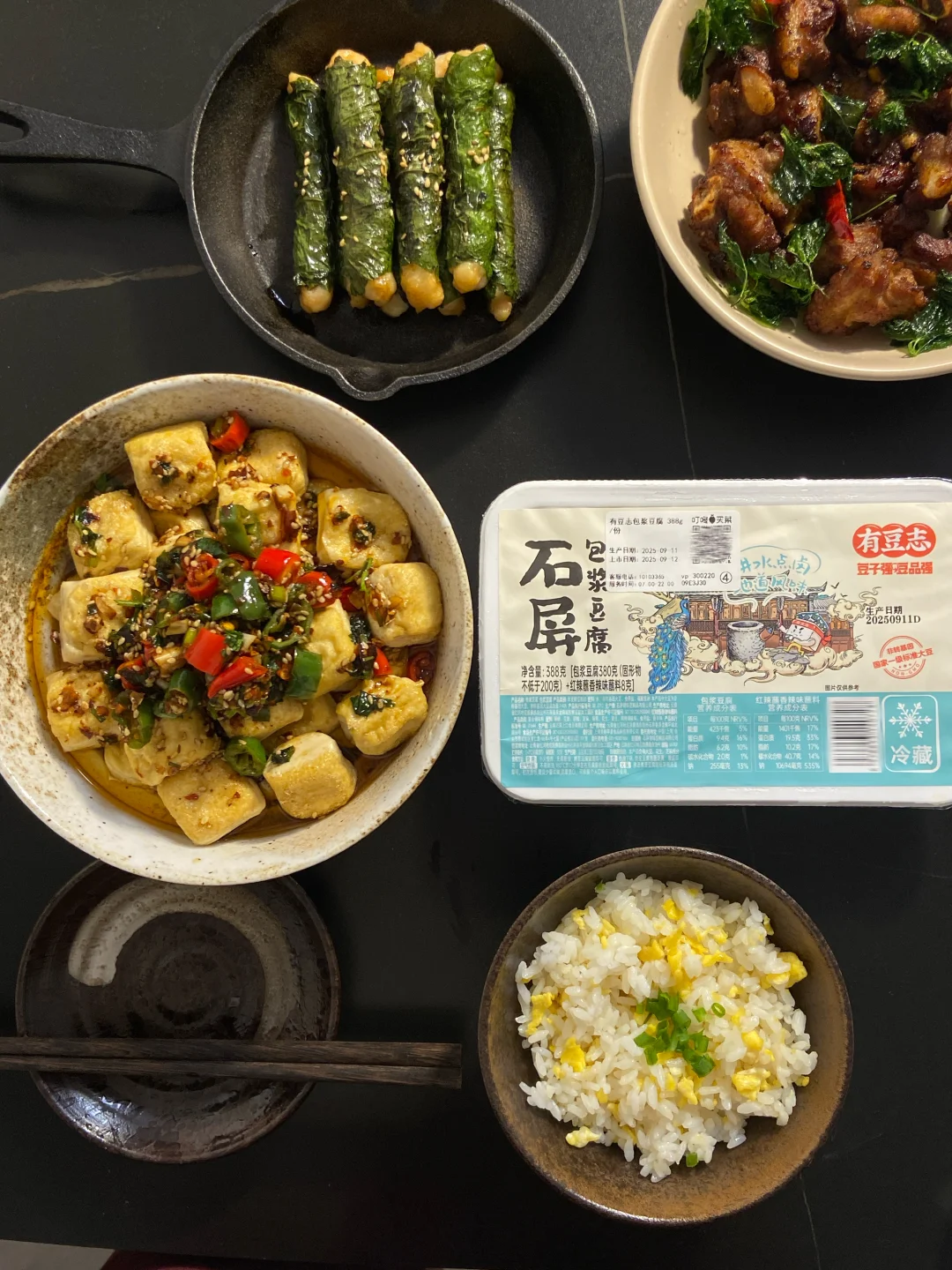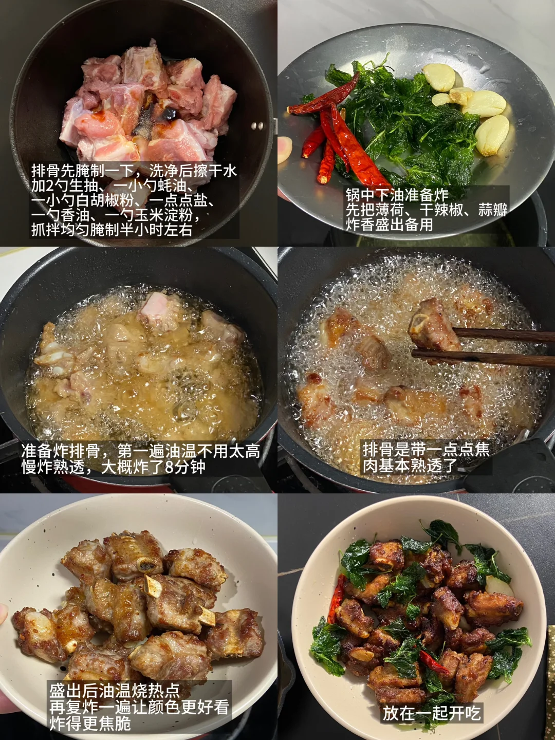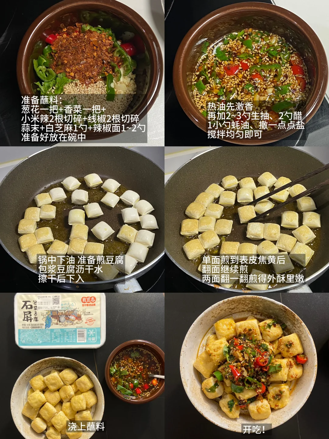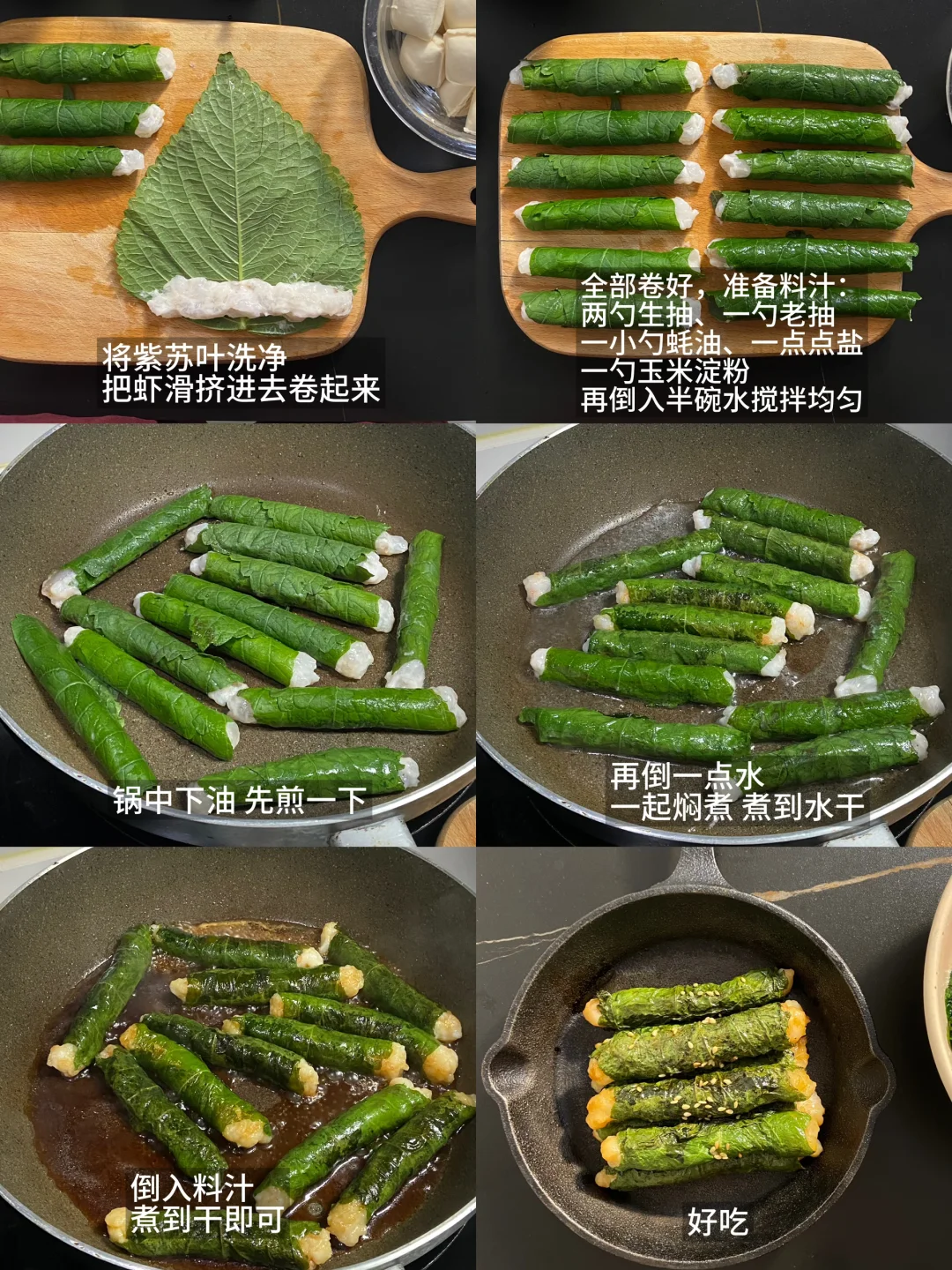 放纵一天,晚上回家太晚了直接来一顿美味宵夜,包浆豆腐配上我特意调的蘸料真好吃,还有这个排骨,炸得色香味俱全,爱吃这一顿!食谱如下: ——————【包浆豆腐】—————— 食材: 有豆志包浆豆腐|蘸料 步骤: 1)先准备好蘸料:葱花一把+香菜一把+小米辣2根切碎+线椒2根切碎+蒜末+白芝麻1勺+辣椒面1~2勺,准备好放在碗中 2)热油先激香,再加2~3勺生抽、2勺醋、1小勺蚝油、撒一点点盐,搅拌均匀即可 ——————【香炸排骨】—————— 食材: 排骨350g左右|薄荷|蒜瓣|干辣椒 步骤: 1)排骨先腌制一下,洗净后擦干水,加2勺生抽、一小勺蚝油、一小勺白胡椒粉、一点点盐、一勺香油、一勺玉米淀粉,抓拌均匀腌制半小时左右 2)锅中下油准备炸,先把薄荷下入炸到透亮捞出来,这时候油里已经有薄荷的香味了,再把蒜瓣、干辣椒一起放入炸到焦一点盛出 3)准备炸排骨,第一遍油温不用太高,慢炸熟透,大概炸了8分钟,排骨是带一点点焦,肉基本熟透了,盛出后油温烧热点,再复炸一遍让颜色更好看,炸得更焦脆 4)最后把薄荷、干辣椒、蒜瓣放在排骨上开吃 ——————【紫苏虾滑卷】—————— 食材: 紫苏叶|虾滑|料汁 1)料汁准备好:两勺生抽、一勺老抽、一小勺蚝油、一点点盐、一勺玉米淀粉,再倒入半碗水搅拌均匀 2)将紫苏叶洗净,把虾滑挤进去卷起来 3)锅中下油,把紫苏虾滑卷倒入慢慢小火煎,可以中途加一点水一起焖煮到水干,这样更容易熟透,再倒入一点料汁,等料汁煮干即可开 好爱吃包浆豆腐!第一回在叮咚买菜上随便逛的时候顺手买了一盒,没想到特别好吃,今天刚好回家也很晚了,来一顿简单的宵夜快手菜,有豆志包浆豆腐不错,是云南这边的小吃,制作工艺很独特,用的是井水点卤,做出来的豆腐清香细腻,做起来也不费劲,直接上锅煎,是外皮很韧内里细腻滑嫩的口感,配上蘸料吃味道真好!