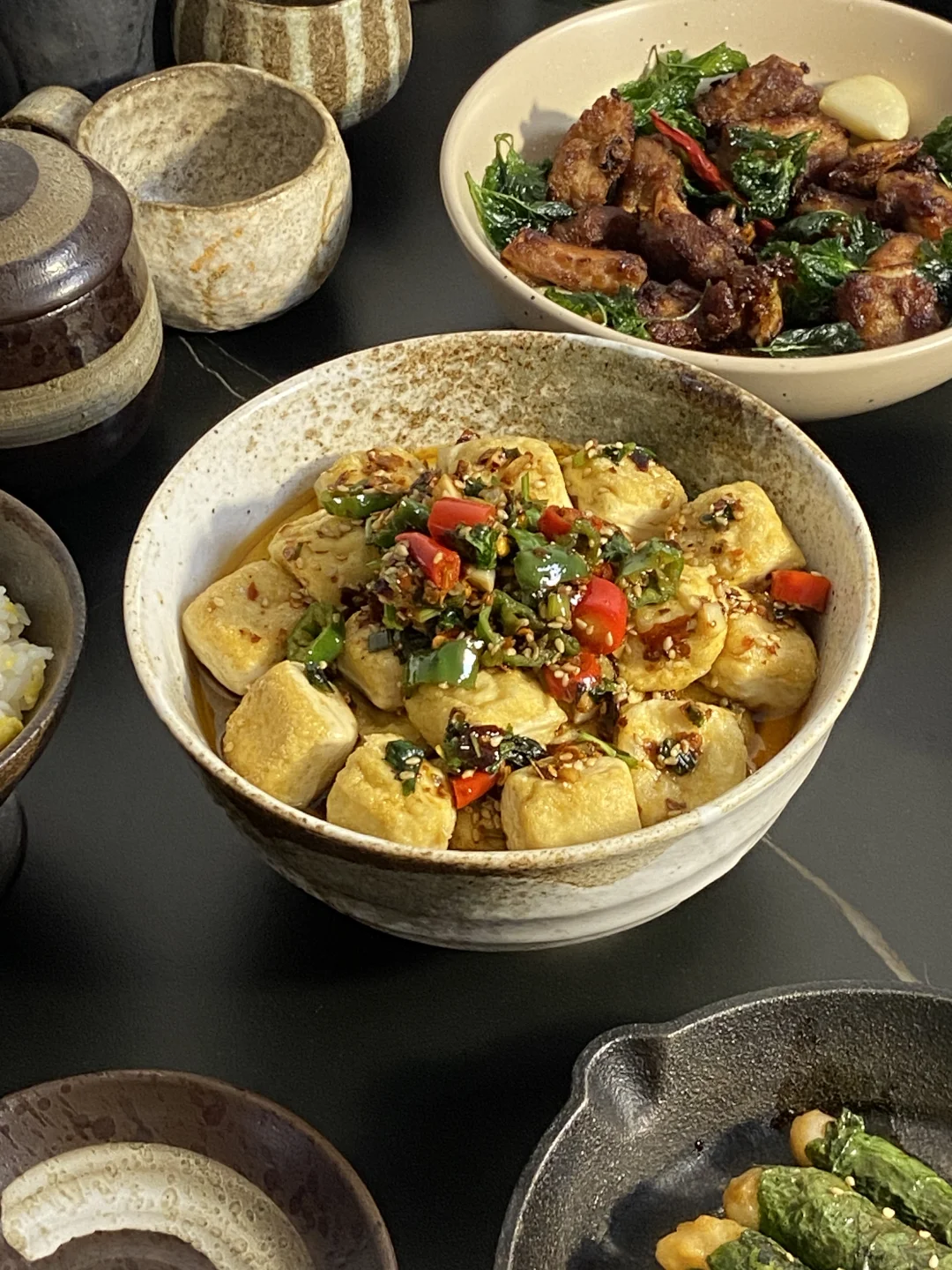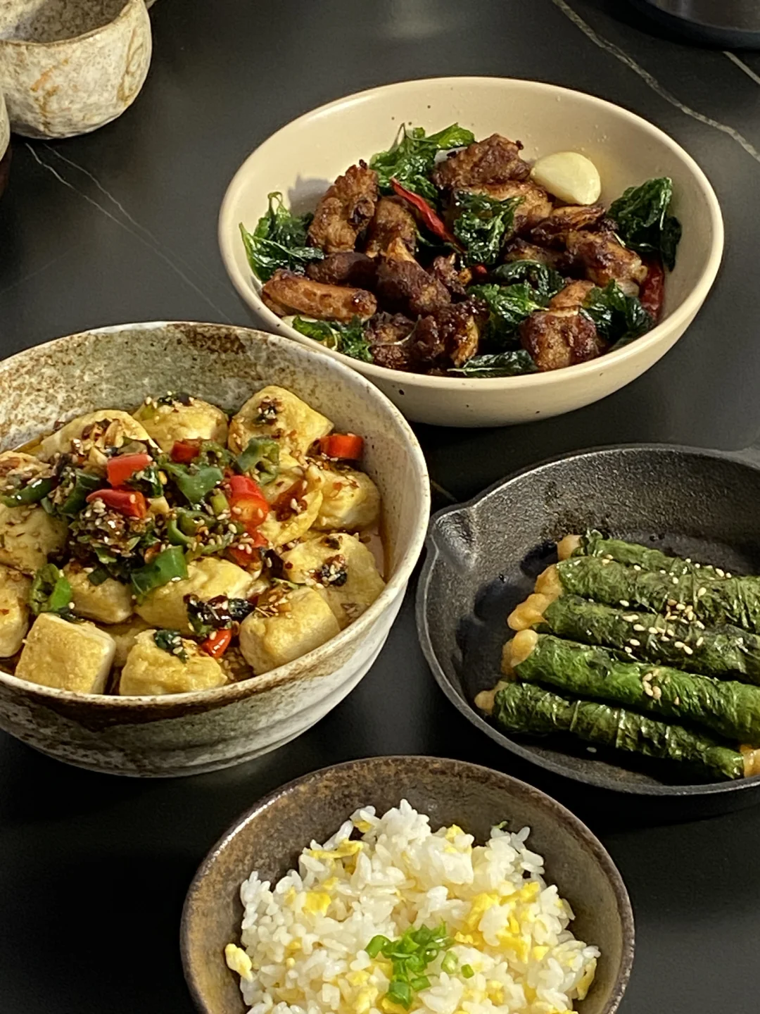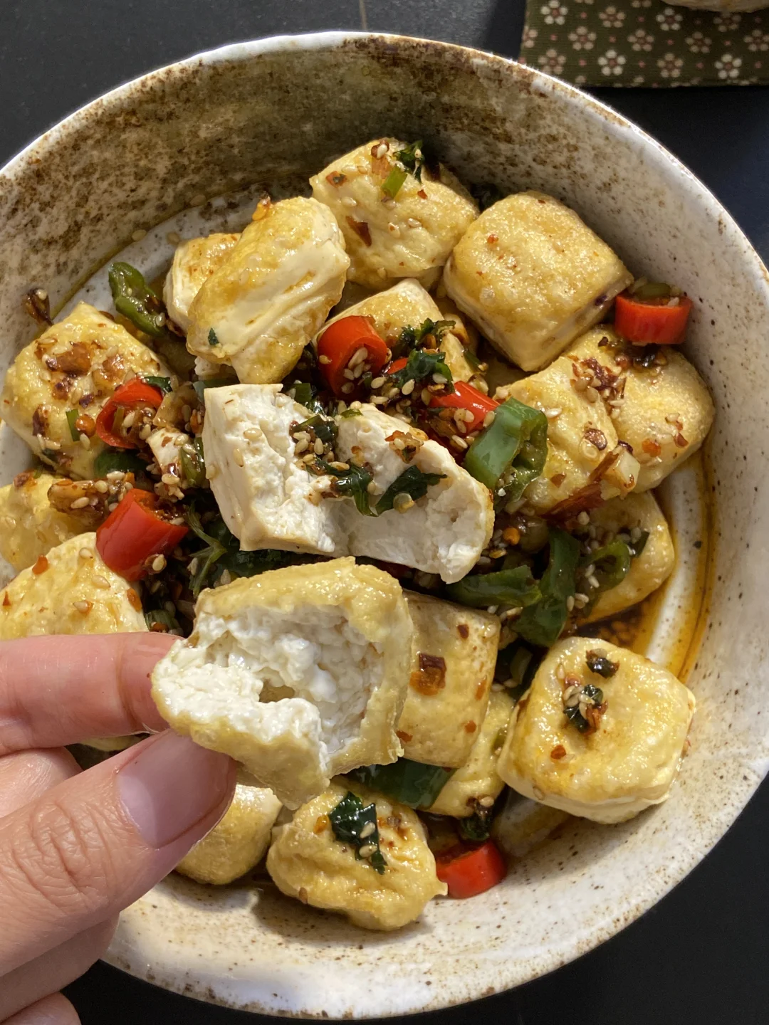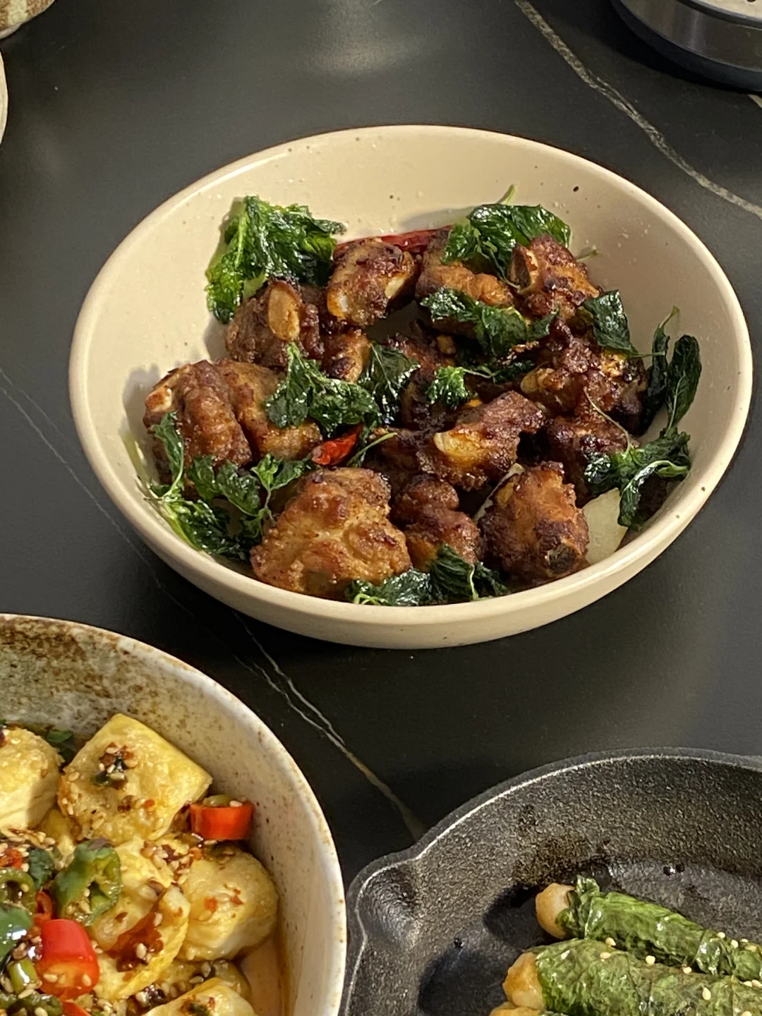 放纵一天,晚上回家太晚了直接来一顿美味宵夜,包浆豆腐配上我特意调的蘸料真好吃,还有这个排骨,炸得色香味俱全,爱吃这一顿!食谱如下: ——————【包浆豆腐】—————— 食材: 有豆志包浆豆腐|蘸料 步骤: 1)先准备好蘸料:葱花一把+香菜一把+小米辣2根切碎+线椒2根切碎+蒜末+白芝麻1勺+辣椒面1~2勺,准备好放在碗中 2)热油先激香,再加2~3勺生抽、2勺醋、1小勺蚝油、撒一点点盐,搅拌均匀即可 ——————【香炸排骨】—————— 食材: 排骨350g左右|薄荷|蒜瓣|干辣椒 步骤: 1)排骨先腌制一下,洗净后擦干水,加2勺生抽、一小勺蚝油、一小勺白胡椒粉、一点点盐、一勺香油、一勺玉米淀粉,抓拌均匀腌制半小时左右 2)锅中下油准备炸,先把薄荷下入炸到透亮捞出来,这时候油里已经有薄荷的香味了,再把蒜瓣、干辣椒一起放入炸到焦一点盛出 3)准备炸排骨,第一遍油温不用太高,慢炸熟透,大概炸了8分钟,排骨是带一点点焦,肉基本熟透了,盛出后油温烧热点,再复炸一遍让颜色更好看,炸得更焦脆 4)最后把薄荷、干辣椒、蒜瓣放在排骨上开吃 ——————【紫苏虾滑卷】—————— 食材: 紫苏叶|虾滑|料汁 1)料汁准备好:两勺生抽、一勺老抽、一小勺蚝油、一点点盐、一勺玉米淀粉,再倒入半碗水搅拌均匀 2)将紫苏叶洗净,把虾滑挤进去卷起来 3)锅中下油,把紫苏虾滑卷倒入慢慢小火煎,可以中途加一点水一起焖煮到水干,这样更容易熟透,再倒入一点料汁,等料汁煮干即可开 好爱吃包浆豆腐!第一回在叮咚买菜上随便逛的时候顺手买了一盒,没想到特别好吃,今天刚好回家也很晚了,来一顿简单的宵夜快手菜,有豆志包浆豆腐不错,是云南这边的小吃,制作工艺很独特,用的是井水点卤,做出来的豆腐清香细腻,做起来也不费劲,直接上锅煎,是外皮很韧内里细腻滑嫩的口感,配上蘸料吃味道真好!
