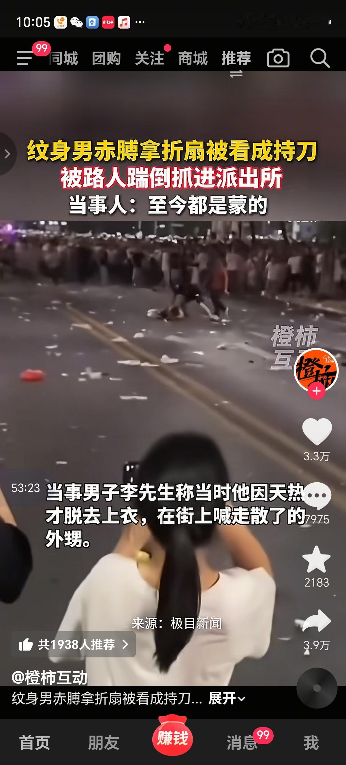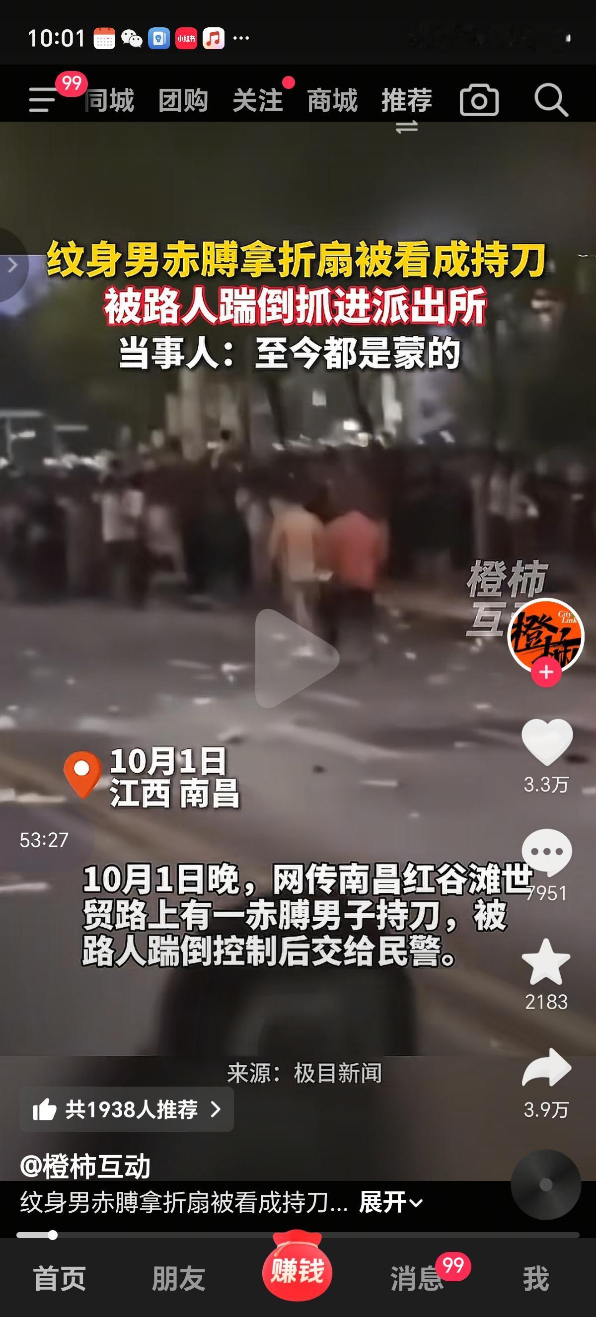 走在路上找孩子被抢东西还被踹,又被抓进派出所,太惨了,但不得不说这个兄弟火了,不管以前是干啥的,现在可以当网红了。 “我至今都是懵的,就想不通一把折扇怎么会被看成刀。”10月3日,江西南昌31岁的李先生面对镜头,举起那把10元钱买的折扇无奈说道。10月1日晚,红谷滩世贸路烟花表演散场时,这位赤膊带纹身的男子因手持折扇大喊走失外甥,被群众误认为“持刀行凶”,遭路人飞踹控制后送进派出所,一场充满戏剧性的乌龙事件由此引发热议。 10月1日当晚,南昌秋水广场周边的烟花表演吸引了数万市民聚集。从事二手车生意的李先生和姐姐带着三个外甥前来观演,途中顺手买了一把折扇和三面小红旗。因现场气温偏高,他脱去上衣,露出常年健身练就的壮硕身材,以及手臂上那个代表身份证号码的条形码纹身。21时许,表演结束后人潮涌动,李先生突然发现其中一个外甥走失,情急之下便大声呼喊外甥的名字。 “喊了没几声,周围的人突然像受惊似的往两边躲,瞬间让出一片空地。”李先生回忆,还没等他反应过来,一名红衣青年迅速上前夺走他手中的折扇,紧接着一名黑衣青年飞身一脚踹中他的臀部,将他踹倒在地。周围几名路人见状立即上前协助控制,有人按住他的胳膊,有人按住双腿,现场传来“抓持刀的”“别让他跑了”的呼喊声。正在附近执勤的民警听到动静后迅速到场,将仍处于懵圈状态的李先生带回派出所调查。 当晚,一段“南昌烟花现场男子持刀被制服”的视频在网络流传,画面中赤膊男子被按在地上,周围人群远远围观,配文称“疑似持刀伤人被群众合力制服”,引发大量网友讨论。10月2日凌晨,南昌网警通过官方微博发布通报辟谣,明确表示经调查,男子所持物品实为折扇,因赤膊带纹身的外形特征,加之夜间光线不足,被群众误认持刀。警方同时提醒,编造传播虚假信息扰乱公共秩序的,将依法追究责任。