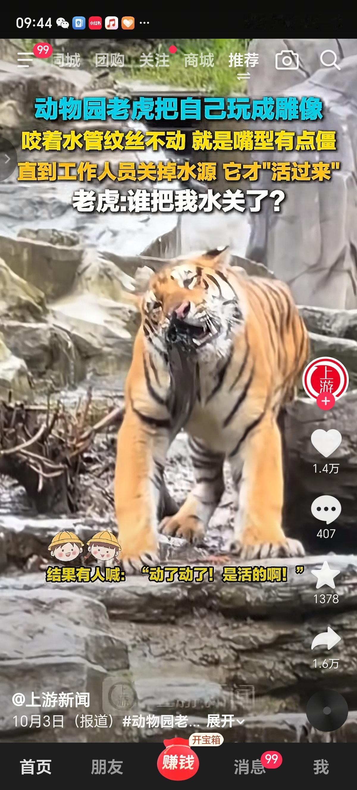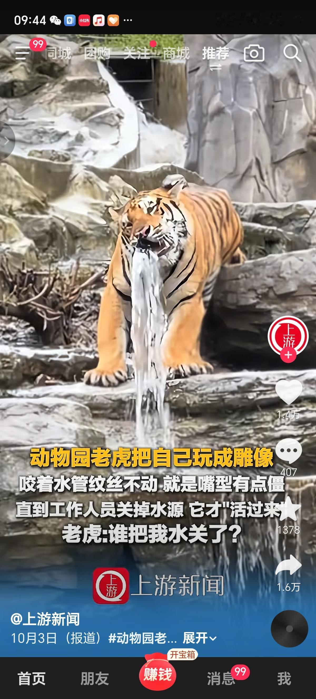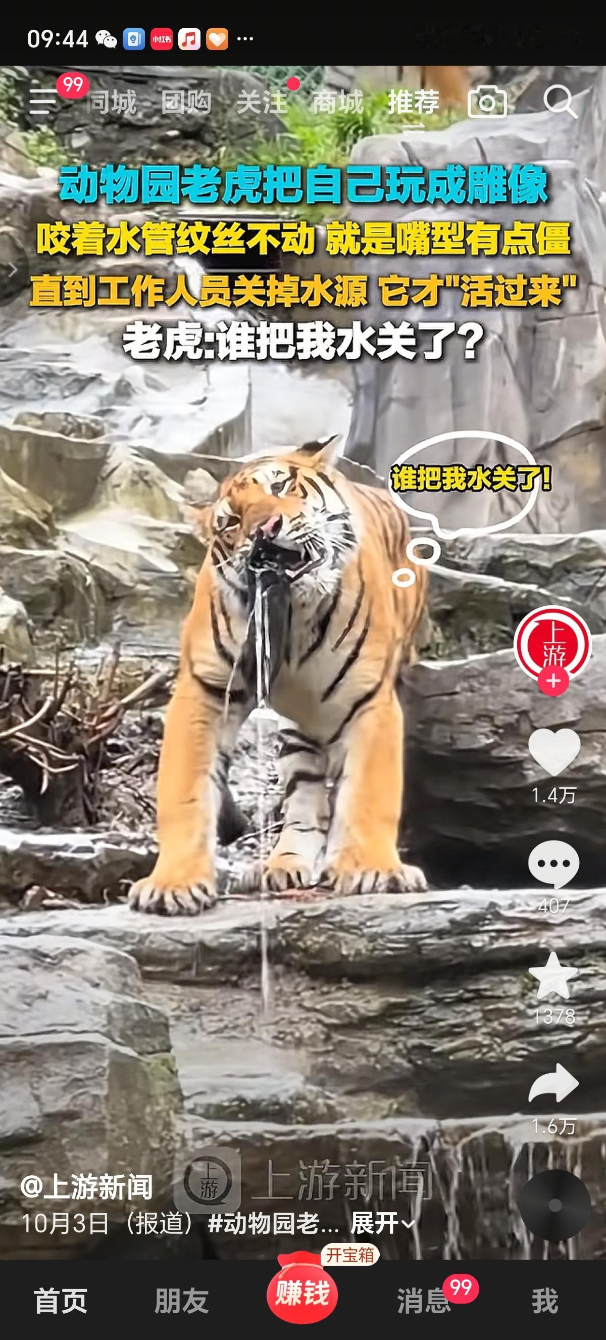 虎口瀑布啊,不用怀疑,这是一只活的老虎,不是雕像,这要不是老虎腿动了,谁能想到老虎这么会玩呢,嘴里叼根水管在那里一动不动装雕像[捂脸]饲养员把水管开关关了还不太乐意,还想继续玩[捂脸][捂脸][捂脸]