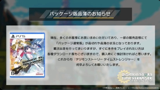 早在发售前,《数码宝贝物语时空异客》日本官方就曾发文提醒,游戏的实体版在发售首周可能“较难获得”,并敦促玩家尽量提前在零售店预约,以确保能够买到光盘。