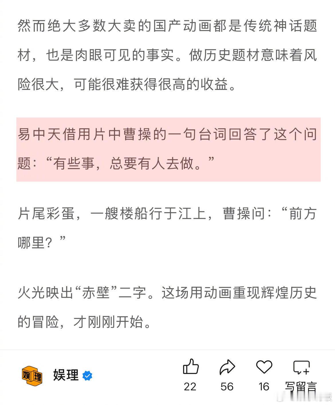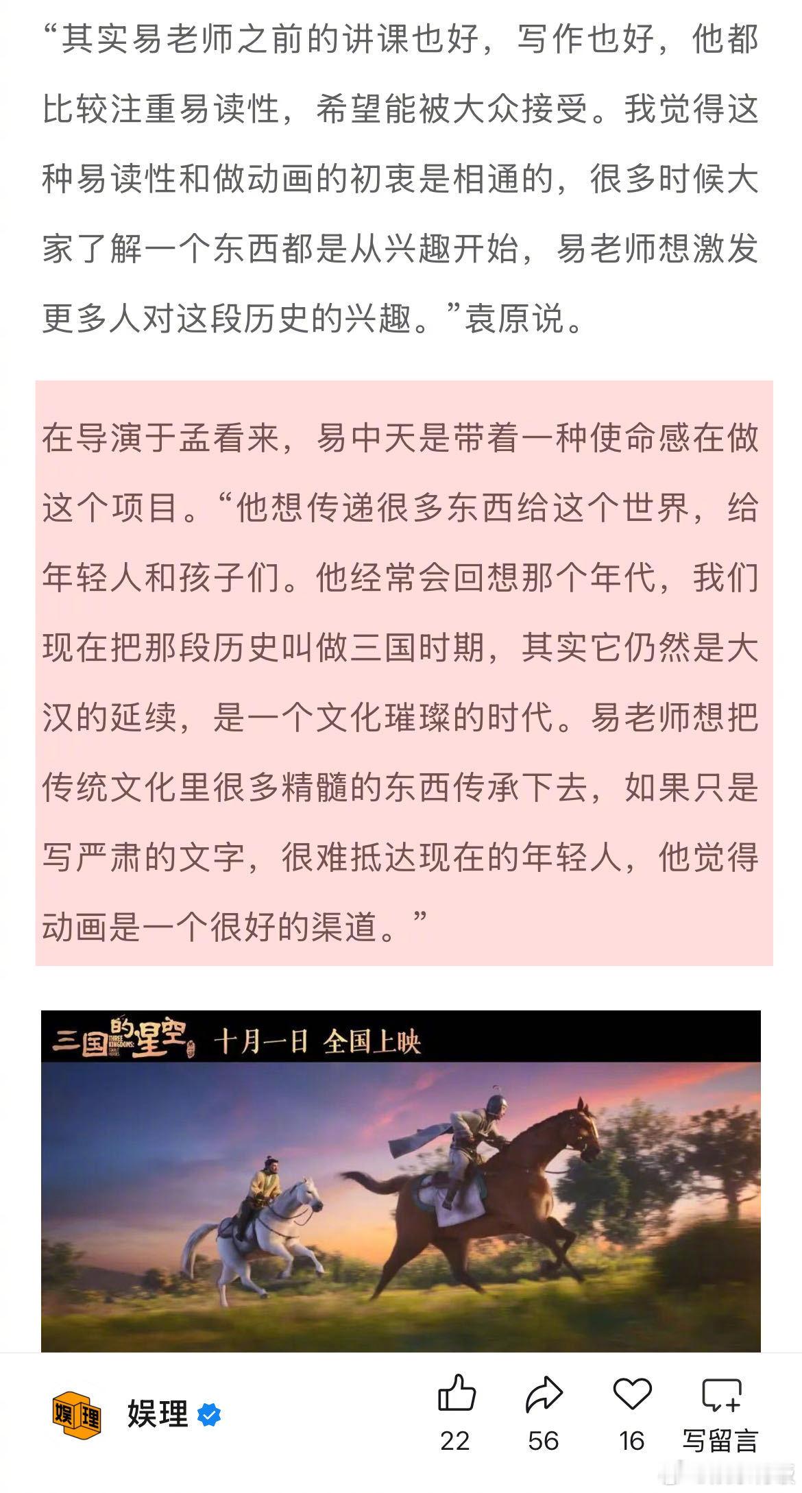 易中天说檀健次的声音就是曹操78岁易中天回应为何想做动画三国 易中天回应用动画电影《三国的星空》实现三国梦: 第一是成本可控,真人电影光场景+服化道就是一笔巨资投入,没有几个亿成本不下来;第二是周期可控,动画电影的工艺流程相对明确,真人大片的周期可能会拉得很长;“第三个说老实话,就是动画角色不会塌房”…娱理独家↓