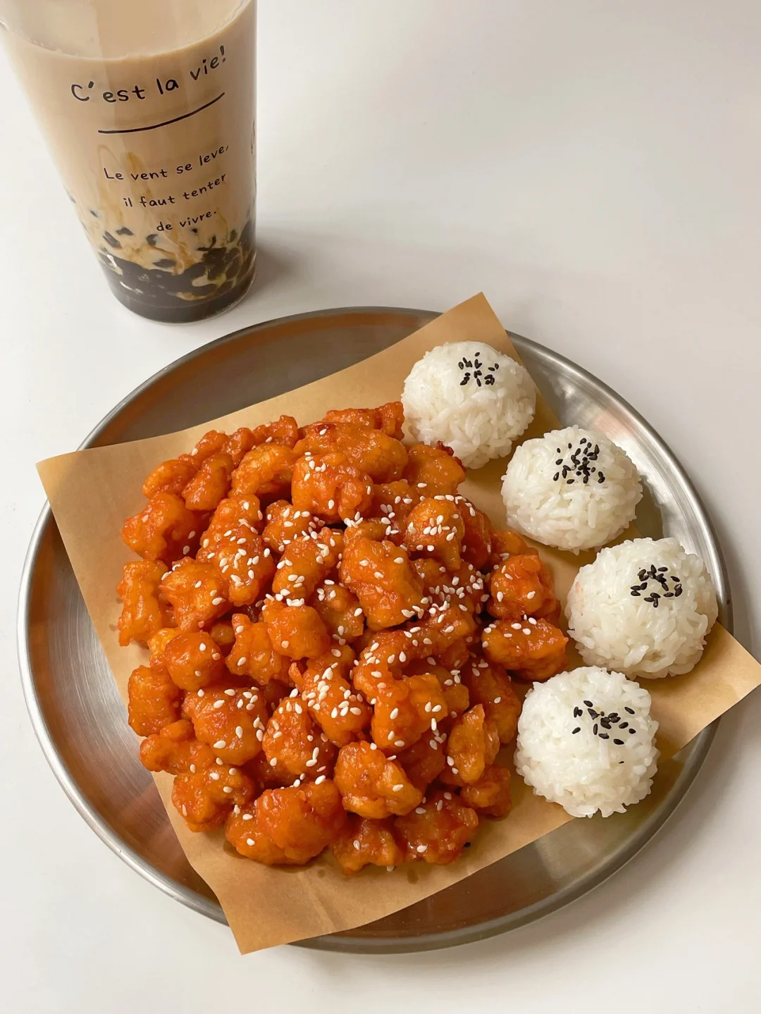 4⃣️锅中热油至六七成热下鸡块,炸至金黄色捞出,空锅中倒糖醋汁再放炸好的鸡块,小火翻拌均匀后撒白芝麻。