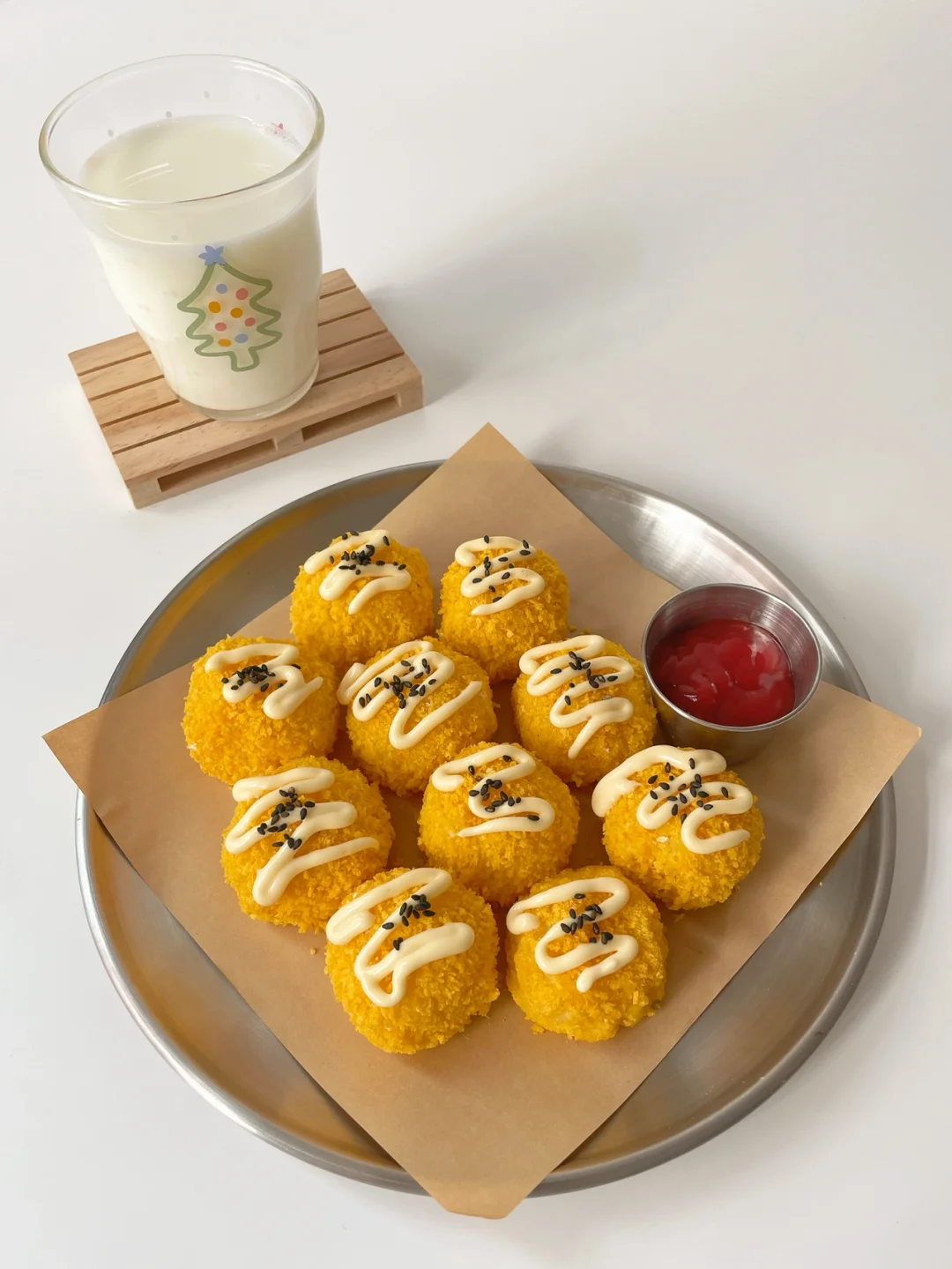 土豆/芝士片/鸡蛋/玉米淀粉/面包糠/蛋黄酱/黑胡椒/盐
