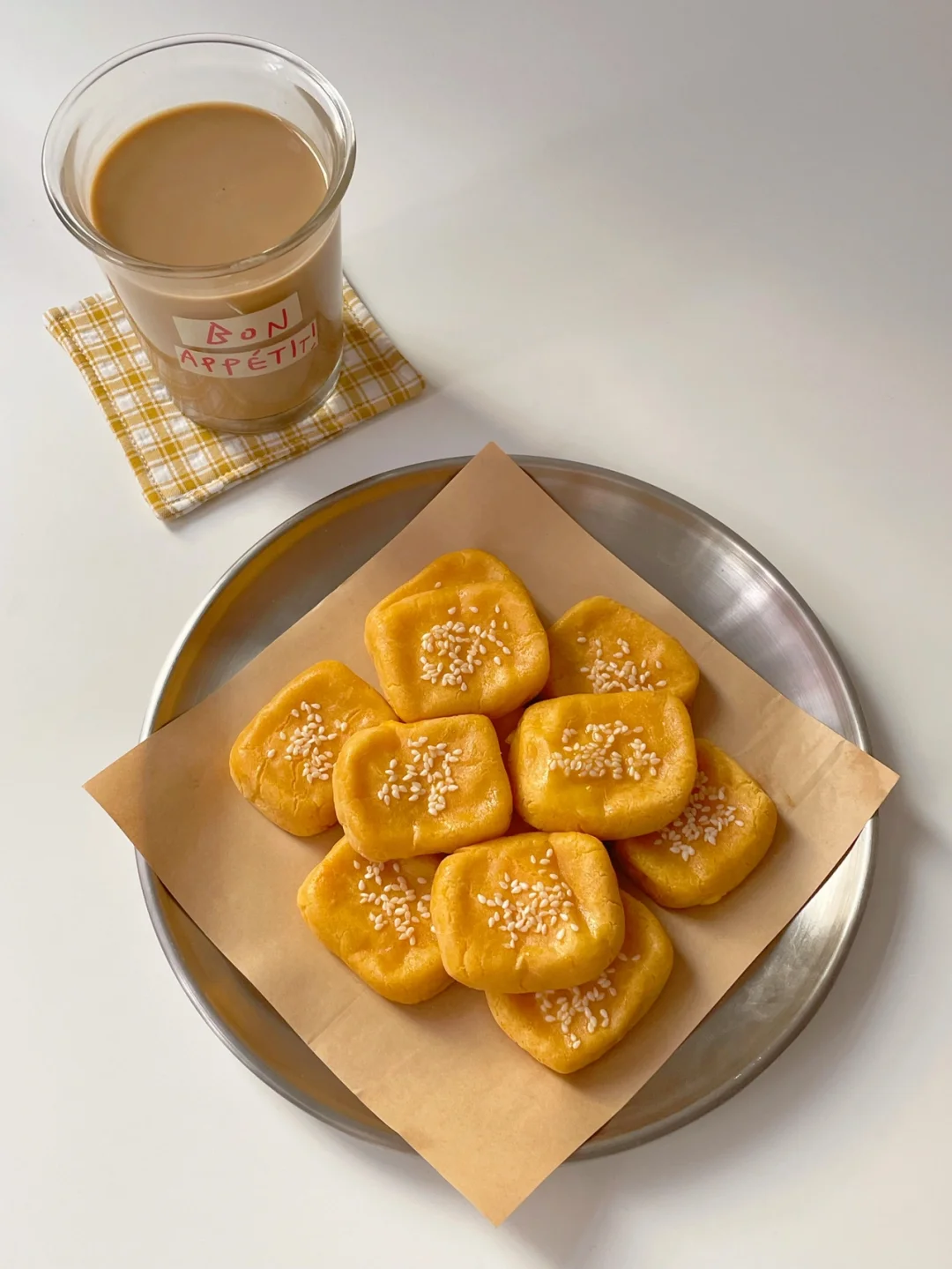 3⃣️再包裹起来,整理成小方块,刷一层鸡蛋液,撒上白芝麻装饰。空气炸烤箱180度15~20分钟。