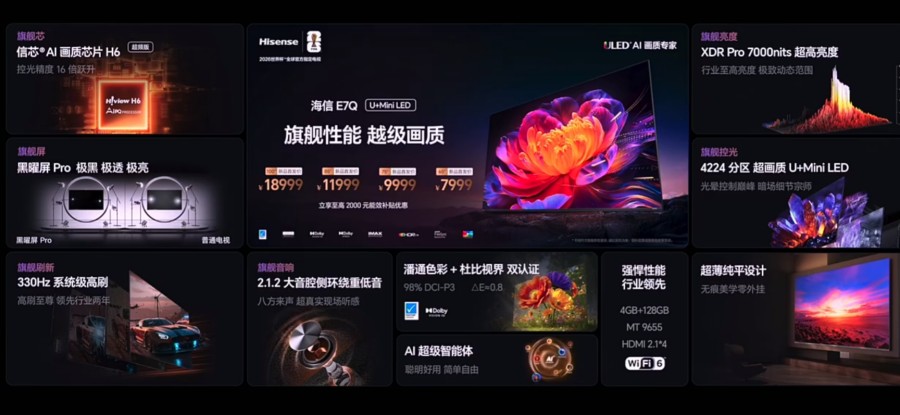 被网友称为“旗舰杀手”的E7Q,走的是堆料路线,可以说是用Mini LED旗舰配置打性价比牌。4224个控光分区、7000nits峰值亮度、330Hz系统级高刷,这些参数在同价位机型里几乎找不到对手。信芯AI画质芯片H6超频版能实时优化画面,看球赛、打游戏时动作更流畅;和帝瓦雷合作的音响系统,声音立体感很强,看大片像坐在影院里。65英寸到100英寸的尺寸选择,不管客厅大小都能找到合适的型号。