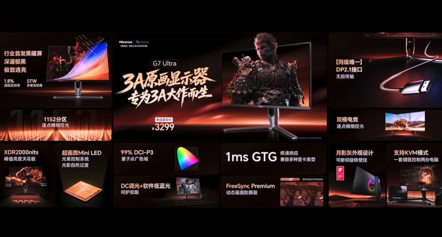值得一提的是,为了满足更多玩家,海信在发布会最后还重磅发售了3A原画显示器G7 Ultra,它采用了旗舰电视同源技术,除了有深邃极黑、极致透亮的行业首发黑曜屏外,还有自研U+Mini LED控光系统,能够精准还原3A光影层次,新品首发价3299元。