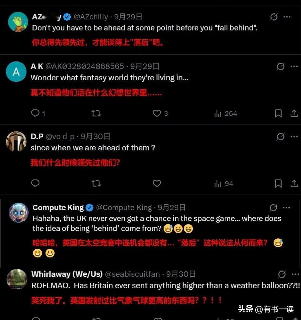 英媒这是自取其辱[皱眉] 这些老外太会说了,句句暴击, 被怼得直戳心窝子, 快把大英媒体的脸都给打烂[泪奔] 英媒说“英国在太空军备竞赛里落后中国”,结果外国网友都笑疯了:“你得先有‘领先过’这回事,才能说自己‘落后’吧!”这不就是自己找尴尬嘛。 看看外国网友的群嘲英媒的评论吧——— “落后?首先得定义‘领先过’是什么状态吧?英国在太空军备领域的‘高光时刻’,难道是上世纪那几个跟着美国沾光的项目?” “建议先搞清楚‘参赛’和‘领先’的区别——中国已经有自主空间站、可重复使用航天器,英国现在讨论‘落后’,是不是有点像没学会走路就担心跑输?” “这逻辑太神奇了,就像一个从没进过赛场的人说自己比冠军慢,重点难道不是‘你压根没在赛道上’吗?” “或许英媒对‘落后’有误解,真正的问题是:英国在太空军备里,到底处于‘落后梯队’,还是‘还没组队’?” 这些老外太会说了,句句暴击, 被怼得直戳心窝子 快把大英媒体的脸都给打烂[泪奔] 昔日日不落帝国何等风光, 如今别说在太空领域上桌竞技, 现在连竞争的资格都没有。 别说上桌了, 菜单上都不一定有它[皱眉]