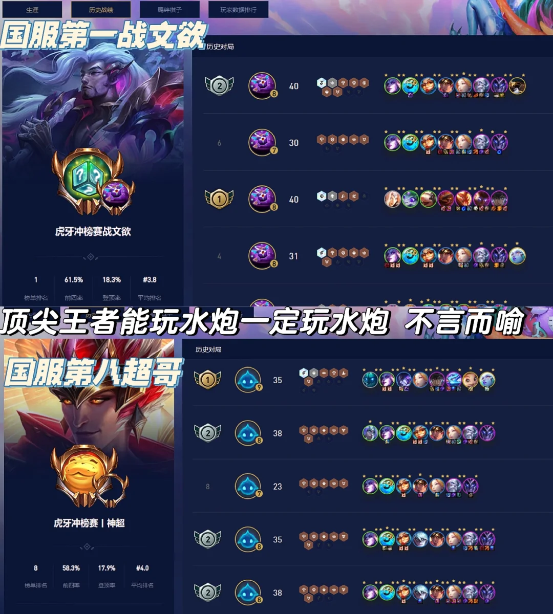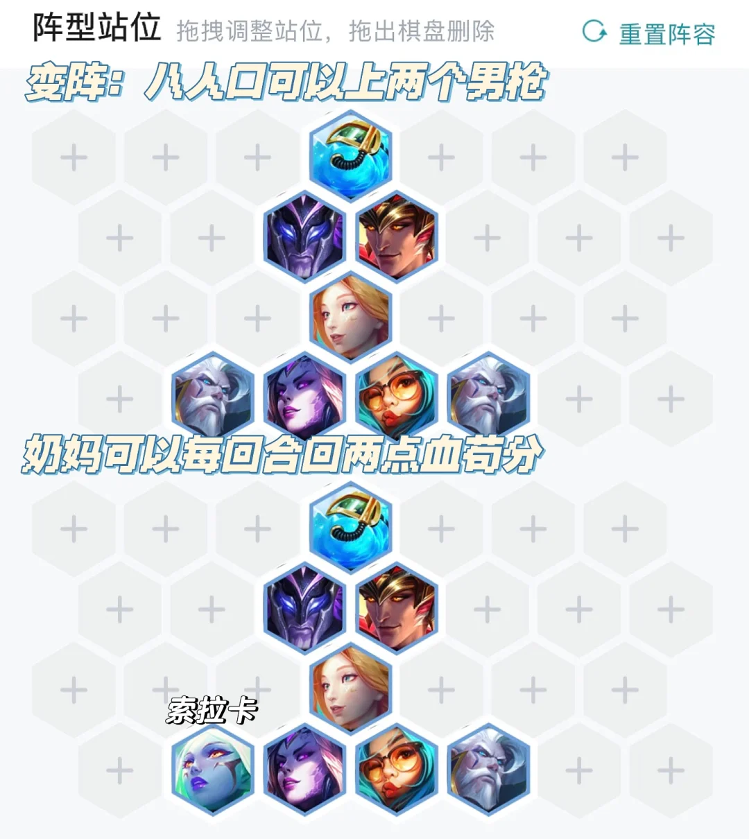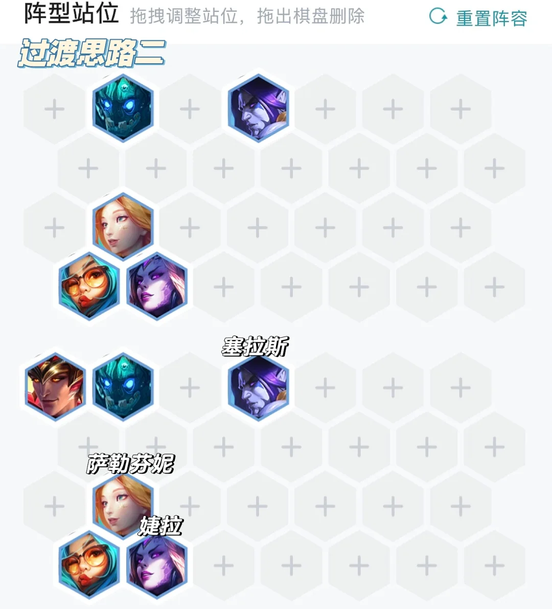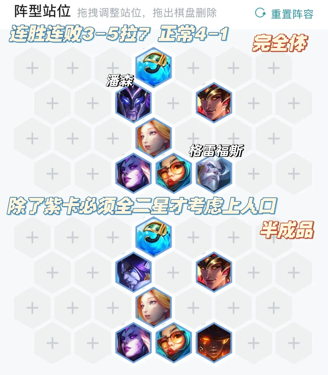 这套阵容不怕一家同行,两家玩都完全OK的,7级做好梭哈的准备,4阶段可以不留钱保连胜即稳分。