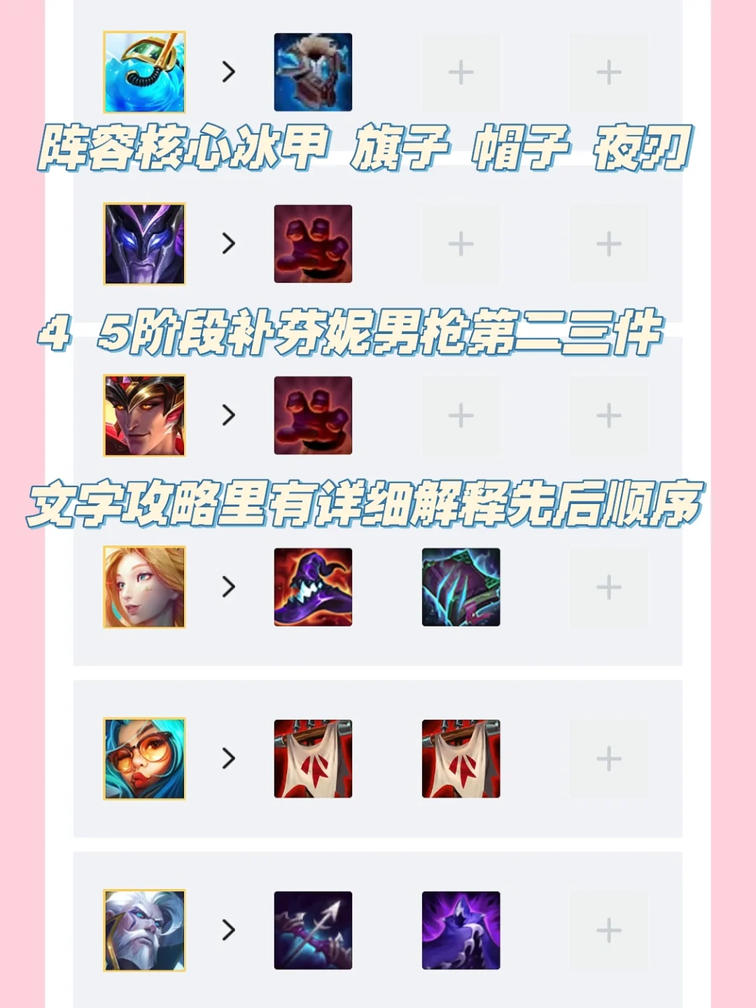 装备思路:强调一下,芬妮炮其实是一个很吃装备得团体阵容,总结了很多场,给大家一个顺序: