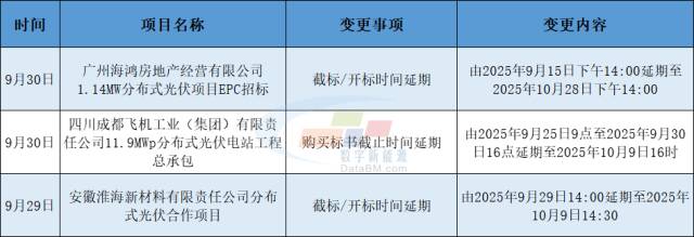 9月30日,广州海鸿房地产经营有限公司1.14MW分布式光伏项目EPC招标发布变更公告。公告显示,该项目截标/开标时间由2025年9月15日下午14:00延期至2025年10月28日下午14:00。