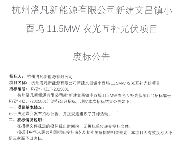 数字新能源DataBM.com获悉,9月30日,浙江杭州洛凡新能源有限公司新建文昌镇小酉坞11.5MW农光互补光伏项目发布废标公告。