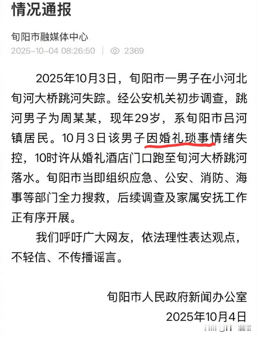 这婚,大可不结,何必寻此短见? 陕西旬阳29岁男子婚礼当天跳河,官方通报已发布,