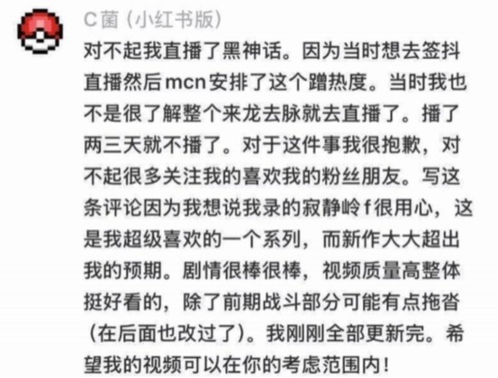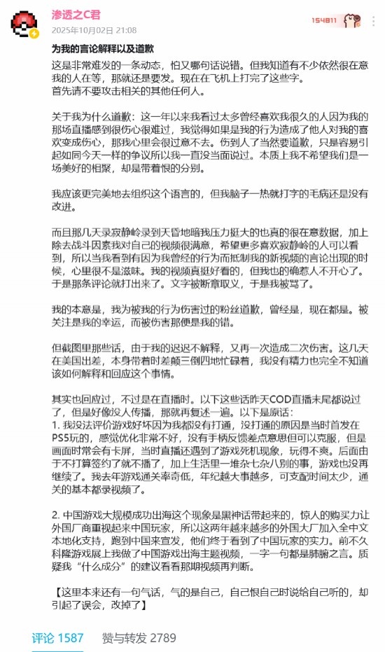 10月2日晚,“渗透之C君”在B站发了一篇长文,正式对此事进行了回应。“渗透之C君”谈到了自己向那位小红书玩家道歉的原因,称在直播《黑神话:悟空》后让一些粉丝感到伤心难过,自己的心里很过意不去,所以自然会道歉。