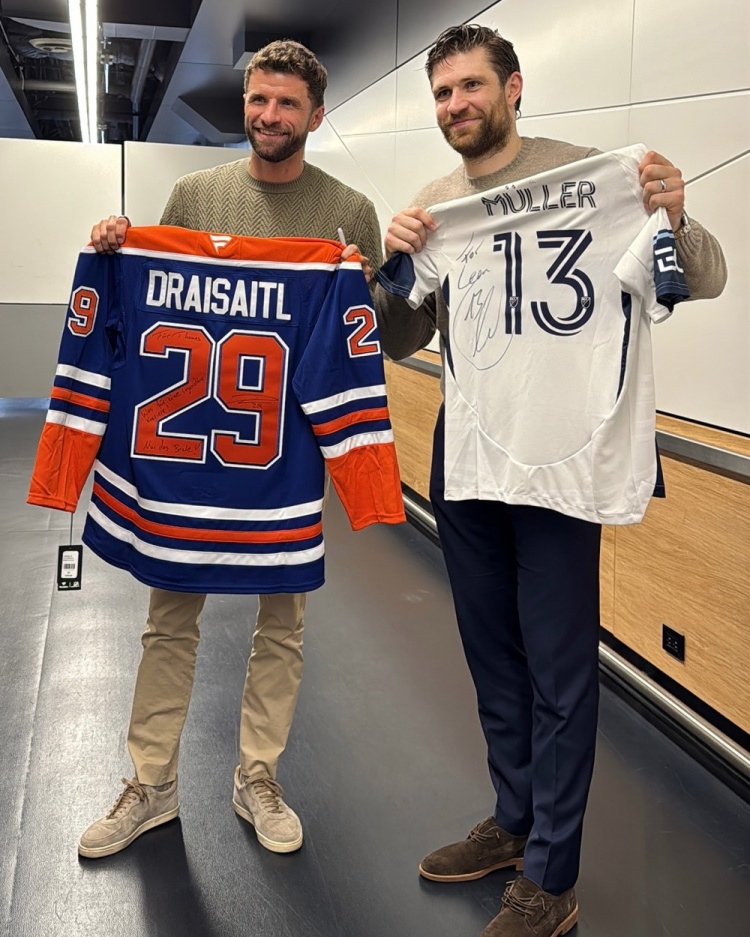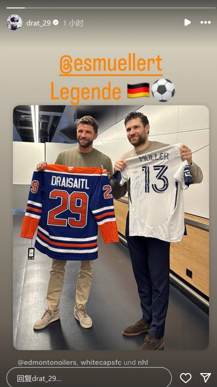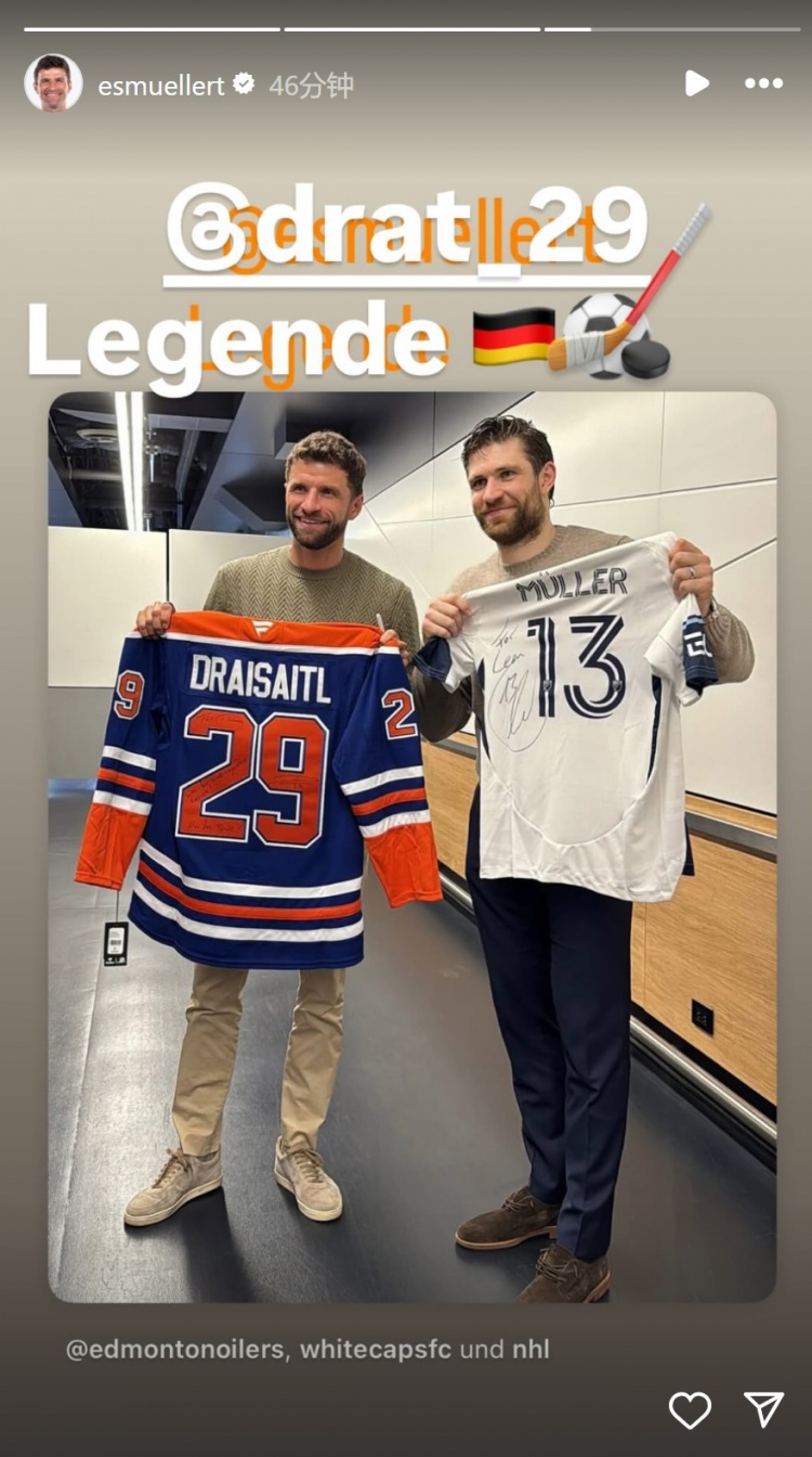 穆勒与德国冰球选手德赖塞特尔交换球衣并合影,后者效力于NHL埃德蒙顿油人队,也是司职前锋,两人社媒转发合照,并互称对方为传奇。