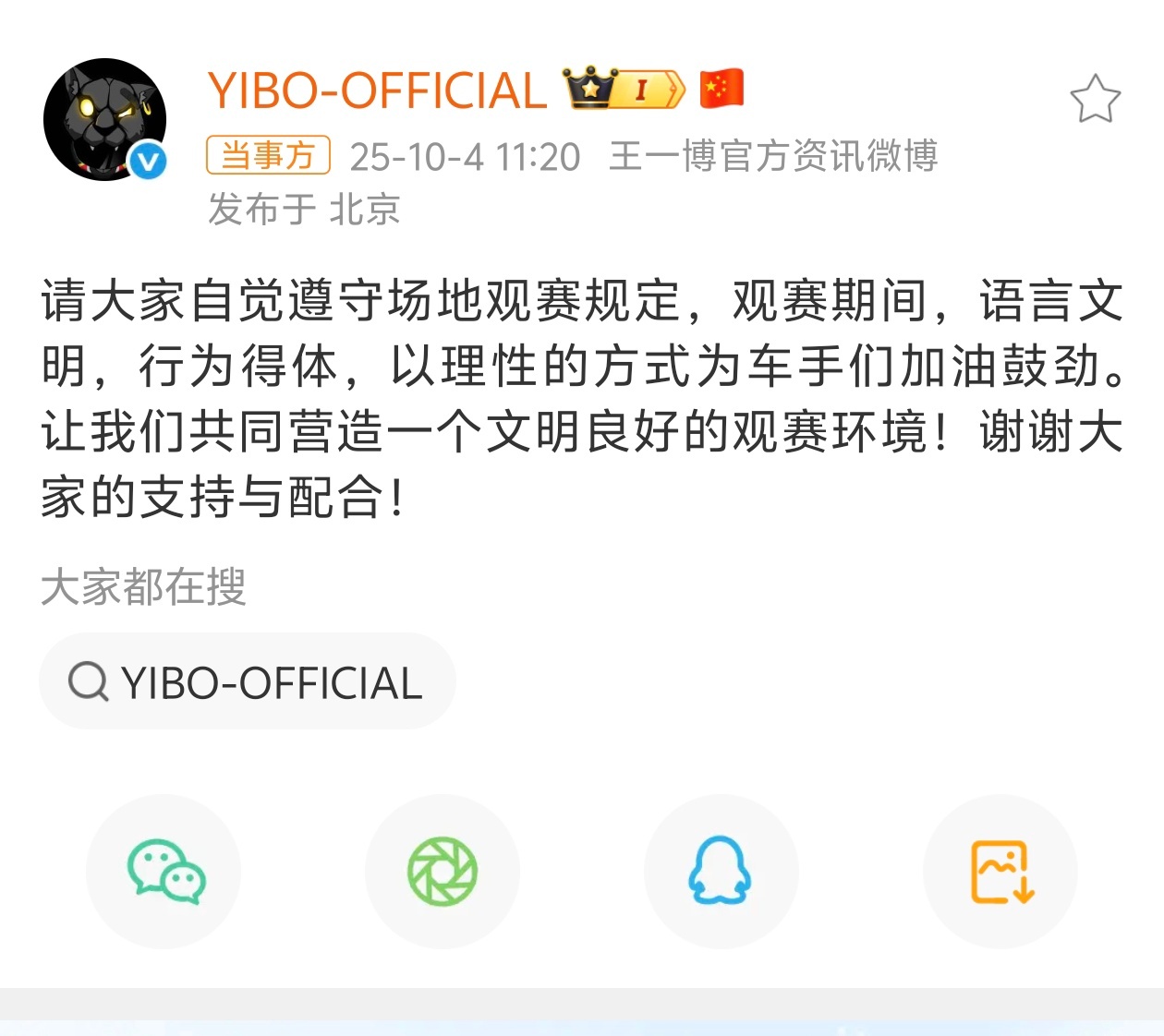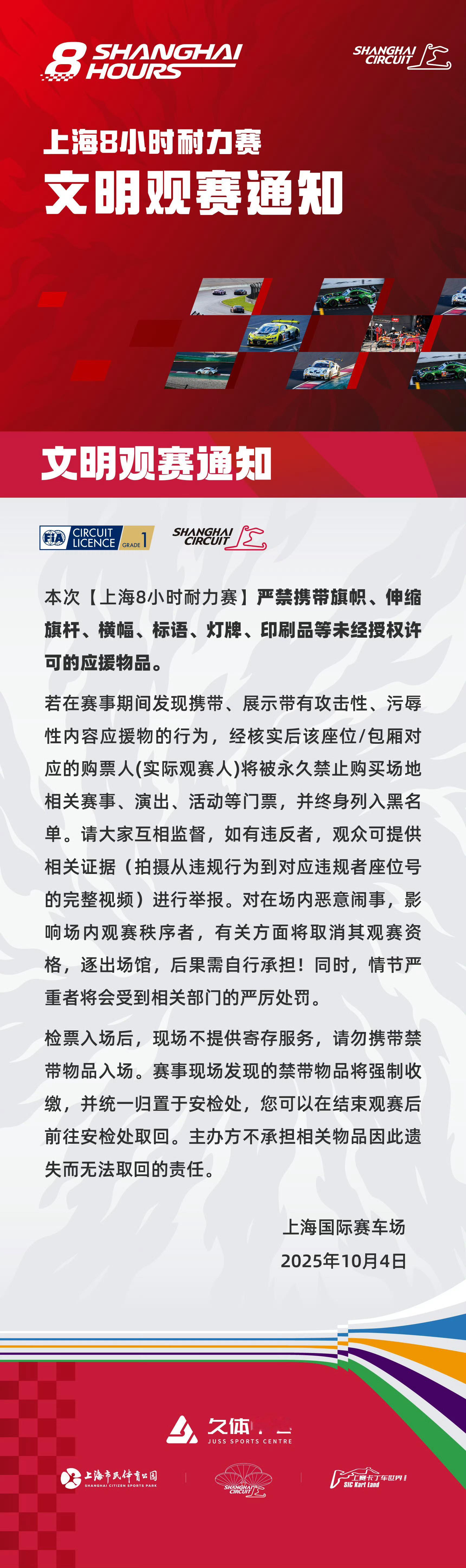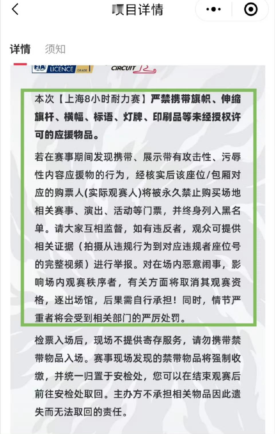 王一博上海8小时耐力赛预告 预告写的清清楚楚,各位车迷发现xx粉丝展示带有攻击性、污辱性内容应援物的行为,经核实后该座位/包厢对应的购票人(实际观赛人)将被永久禁止购买场地相关赛事、演出、活动等门票,并终身列入黑名单!!!!