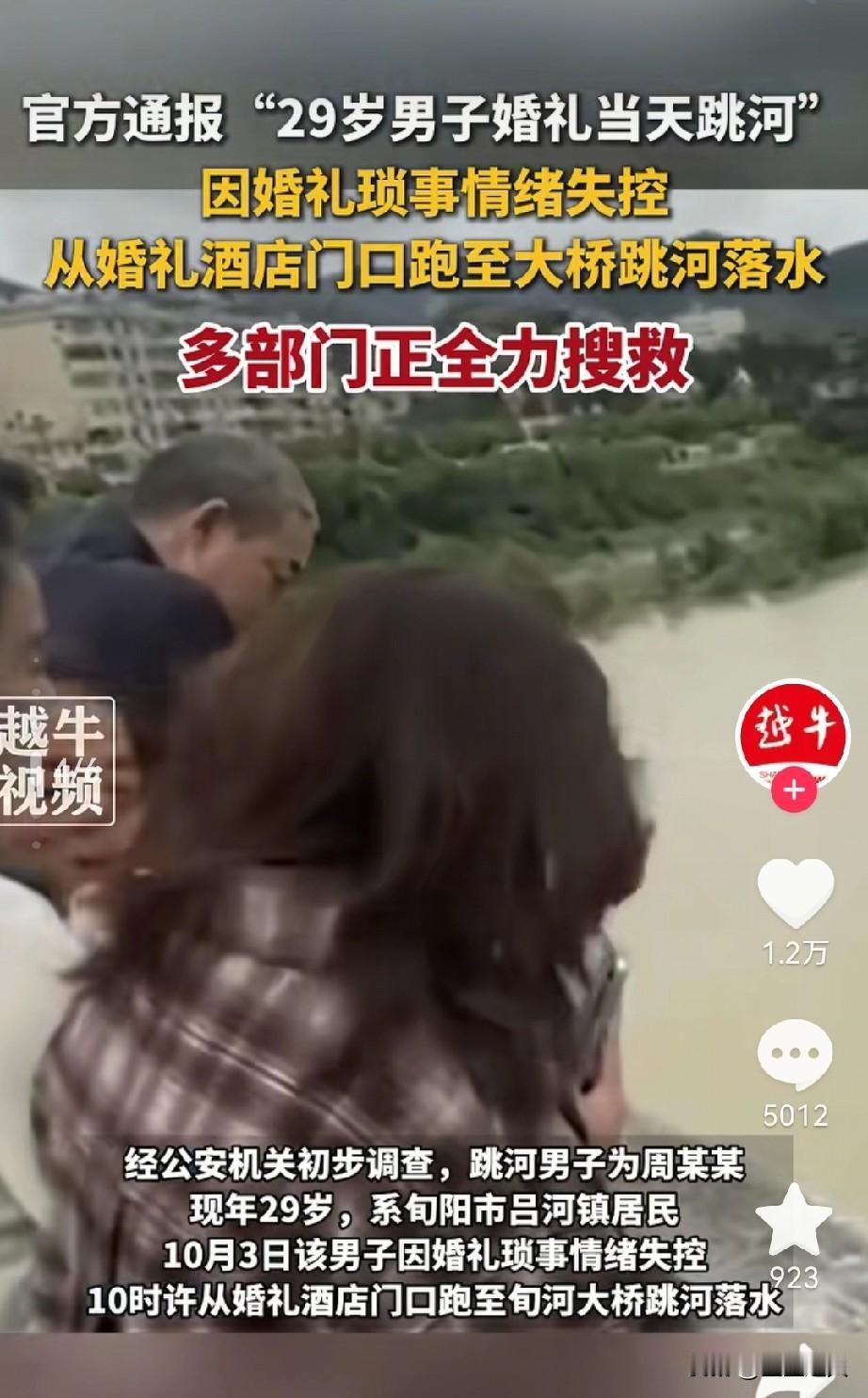 10月3日,陕西旬阳一新郎跳河自杀,知情人透露原因疑似彩礼被临时加价,新郎想不开