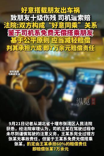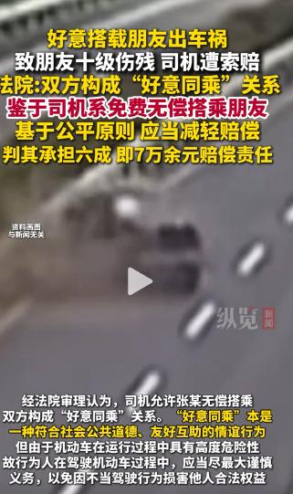 “难怪好人心寒!”湖北武汉,一男子驾车回家时,因为一片好心,就免费带朋友一起走!可万万没想到,路上竟遭遇了交通事故,朋友严重受伤,达到了十级伤残!在交警调查后,认定男子负全部责任!没成想朋友在出院后,竟要求男子赔偿13万元,在男子拒绝后,朋友又告上了法庭,而法院的判决结果让人意外! 九月的武汉,傍晚六点半的街头还没褪去白天的热气。 王某开着自己开了三年的轿车,刚从汉口的公司出来,正打算往江夏的家赶。 突然手机响了,是认识五年的朋友张某。 “老王,你是不是往武汉市区走?我今天要去武昌办事,没买到高铁票,能不能搭你一段?” 电话里张某的声音有点急,说自己等了快一小时公交还没来,眼看天要黑了,心里发慌。 王某想了想,大家都是朋友,顺路搭一段也没什么,而且路上有人聊聊天,也能解解闷,就一口答应了,约在前面的加油站碰面。 十几分钟后,张某提着个小背包匆匆赶来,上车后还一个劲道谢,太谢谢你了老王,不然我今晚都不知道怎么回去。 王某笑着摆手,多大点事,顺路的事。 两人聊着最近的工作、孩子的学习,车子很快上了白沙洲高架。 大概走了二十多分钟,王某觉得车里有点闷,想把空调调低一档,就腾出右手去碰空调按钮。 但也就是这一两秒的功夫,前面的黑色轿车突然踩了刹车,原来是前方路面有个小坑,对方要减速躲避。 王某心里一慌,赶紧往左打方向,可当时车速有六十多码,车子没稳住,“砰”的一声巨响,右侧车头直接撞在了高架的防护栏上。 安全气囊瞬间弹了出来,王某因为系了安全带,只是胳膊被气囊蹭得有点红,没大碍。 可副驾驶的张某,因为上车时嫌麻烦没系安全带,整个人随着惯性往前冲,头重重磕在了车窗上,当时就捂着额头喊疼,血很快从指缝渗了出来。 王某吓坏了,赶紧解开安全带下车,一边扶着张某,一边手忙脚乱地打120和交警电话。 救护车很快把张某送到了附近的三甲医院,检查结果显示颅骨轻微骨折,后续又经历了两次复查和康复治疗。 三个月后,司法鉴定结果出来了,张某的伤情构成十级伤残。 前前后后算下来,医疗费花了5万多,护理费1万2,还有张某因为没法上班产生的误工费4万,再加上伤残赔偿金,总共加起来有13万多。 一开始,王某还经常提着水果去医院探望,每次都跟张某说。 兄弟,这次是我不小心,该我担的责任我肯定不推。 可当张某的家人把13万的费用清单摆在他面前,要求他全额赔偿时,王某懵了。 我没要你一分钱车费,油钱都是我自己加的,就算我有责任,也不能让我全赔吧? 两人从一开始的好好商量,慢慢吵到红脸,原本不错的朋友情分,一下子就淡了。 之后又谈了好几次,王某最多只愿意出3万,张某家人不同意。 最后没办法,张某只能拿着事故认定书、医疗费票据和司法鉴定报告,把王某告到了武汉东湖新技术开发区人民法院。 法院开庭那天,双方都来了,还有不少关注“好意同乘”的网友在法院门口等着消息。 庭审时,法官先核实了事故经过:交警的认定书很明确,王某因为驾驶时分心操作不当,负事故全部责任,张某没有过错。 法官说,王某无偿让张某搭车,是出于朋友情谊,这种善意值得鼓励,所以不能让他全额赔偿。 但作为司机,王某在驾驶时分心,没尽到谨慎义务,导致张某受伤,责任也不能完全免除。 最后法院综合考虑后判决,减轻王某40%的责任,由他承担60%的赔偿,也就是7万2千多元。 判决下来后,王某和张某都没上诉,王某后来在采访里说,虽然要赔钱,但心里多少有点底了,至少不是全赔,也算给兄弟一个交代。 有网友说,以后真不敢让人搭车了,万一出事就是麻烦,赔了钱还伤感情。 还有网友分享自己的经历,之前我同事想搭我车,我怕出事,找借口婉拒了,现在看这个案子,还好没答应。 但也有不少网友觉得法院判得合理,不管收没收钱,开车的人就得对车上的人负责,不然谁还会认真开车?总不能说‘我是好心’,就不管别人的安全吧? 其实,类似的案子之前在湖北十堰也发生过。 十堰张湾区法院去年审结过一起类似案件:司机无偿搭朋友,也是因为操作不当出事故,最后法院也是减轻了司机的责任。 当时法官就解释过,法律这么规定,就是为了找到“善意”和“责任”的平衡点。 既不让好心帮忙的人寒心,也不让受伤的人白受损失。 毕竟,再深的朋友情分,再浓的善意,也得建立在安全的基础上。 以后再有人找你搭车,别忙着拒绝,先提醒对方系好安全带,自己也集中注意力开车。 要是你搭别人的车,主动系上安全带,多留意路况。 这样,“好意同乘”才能一直是街头巷尾的温暖小事,而不是闹上法庭的遗憾。 说到底,让“好心”不被辜负的,不只是法律,还有我们每个人对安全的重视。 信息来源:纵览新闻发布视频
