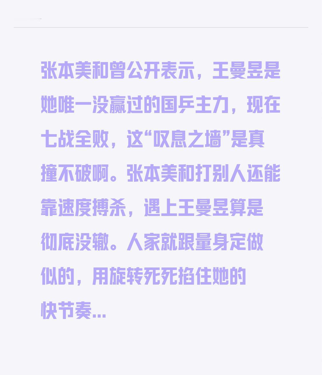 张本美和曾公然坦言, 王曼昱是她至今唯一未曾战胜过的国乒主力选手, 如今已七战皆