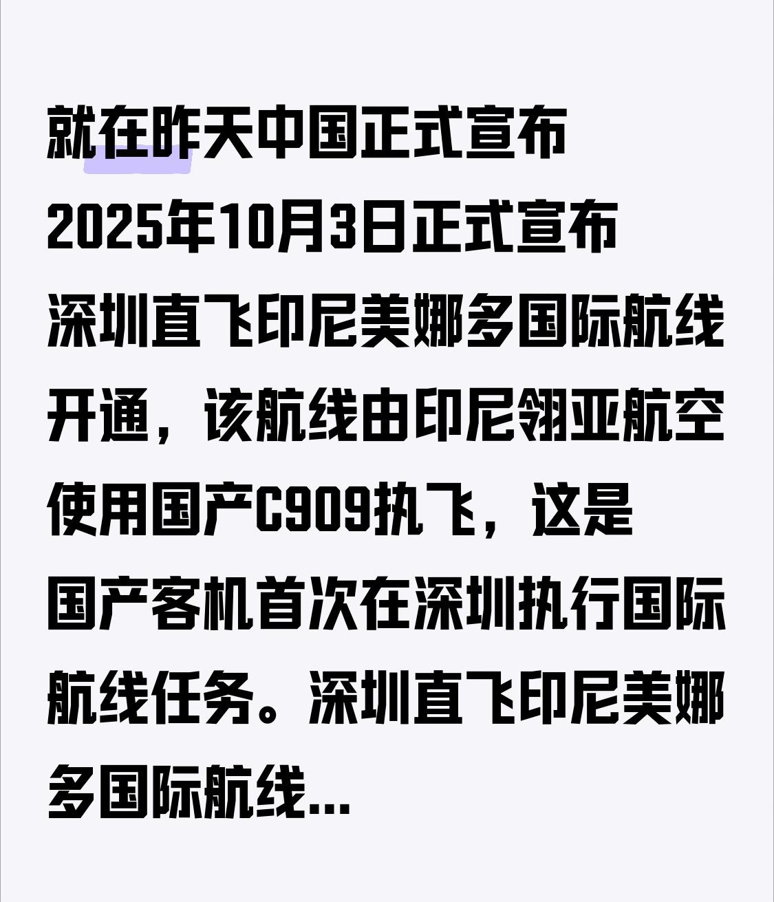 就在昨日 中国正式宣布 2025年10月3日,深圳直飞印尼美娜多的国际航线正式通航。该航线由印尼翎亚航空选用国产C909客机执飞,这是国产客机首次在深圳承担国际航线飞行任务。 深圳直飞印尼美娜多的国际航线正式启航,由翎亚航空的C909客机担当飞行重任。此航线意义重大,它标志着国产飞机首次从深圳飞赴国际航线。 C909客机自2016年投入运营以来,已交付160多架,在各大航空公司的运营中表现出色。 东南亚各国对东方大国游客的需求十分迫切。深圳自2020年恢复国际航线以来,目前已有22个直飞航点,大大缩短了旅行时间,增强了航线的自主性与选择性。 翎亚航空C909客机首航告捷,这不仅是深圳航空史上的一件大事,更是东方大国制造业又一成功范例,体现了东方大国在制造业领域的进步与发展。 期待深圳未来开通更多国际航线,推动国家形象迈向新高度。直飞新航线 直飞新航线 直飞攻略 美国直飞增航 东航直飞 直飞新航线 直飞攻略 东航直飞 美国直飞增航