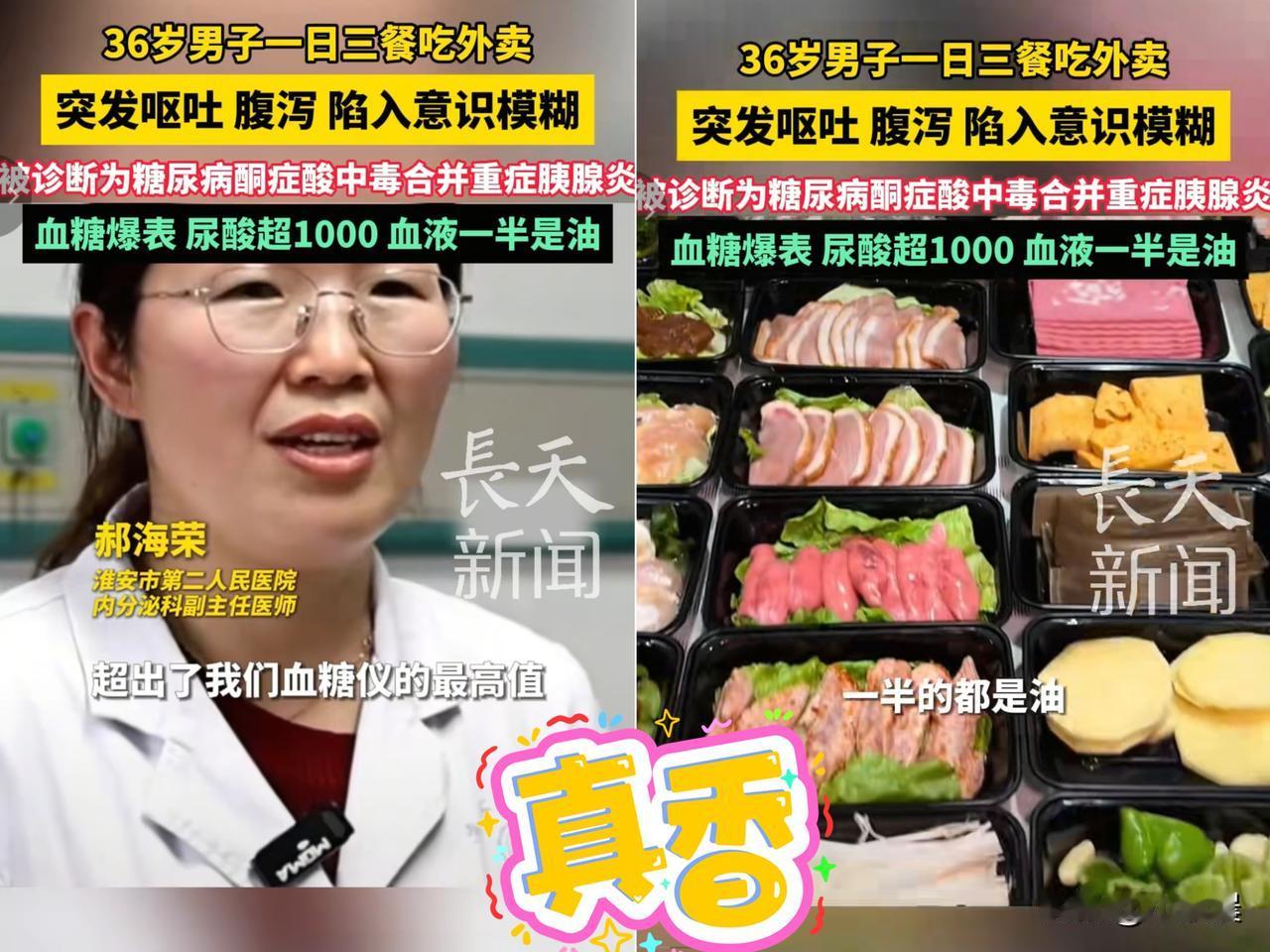 还敢天天顿顿都点外卖吗? 淮安那哥们才36, 就因为公司没食堂、工作又忙,大半年 一日三餐全靠外卖凑活,结果前阵在办公室突然肚子疼得直不起腰,吐得稀里哗啦,最后连人都迷糊站不稳。 送医院一查吓懵——血糖高到仪器测不出来,尿酸飙上天,抽出来的血上面飘着一层白花花的油,直接查出糖尿病酮症酸中毒加重症胰腺炎,医生说就是他天天吃的红烧肉、水煮鱼、炸鸡这些高油高盐外卖作的。 真别光怪外卖“坑人”,就算自己在家做,天天重油重盐烧大肉、不碰一口青菜,身体照样得垮。 打工人没时间做饭咱都懂,但点外卖时多上点心总该行吧? 别总盯着油炸、红烧、麻辣的菜点,选那种带蔬菜的套餐,哪怕额外加份清炒时蔬,配个水果、无糖酸奶,都比顿顿“重口味”强,偶尔抽十分钟煮碗面,丢点青菜卧个蛋,又省钱又养人。 我瞅着不少人说“明知道不健康但没时间”,可健康这事儿真不能赌侥幸,不是说吃外卖就一定坏,关键是你会不会选、懂不懂搭配。 你们平时一周得点几次外卖啊? 要是没时间做饭,你们都有啥既能省时间又吃得舒服的小法子,评论区唠唠呗~