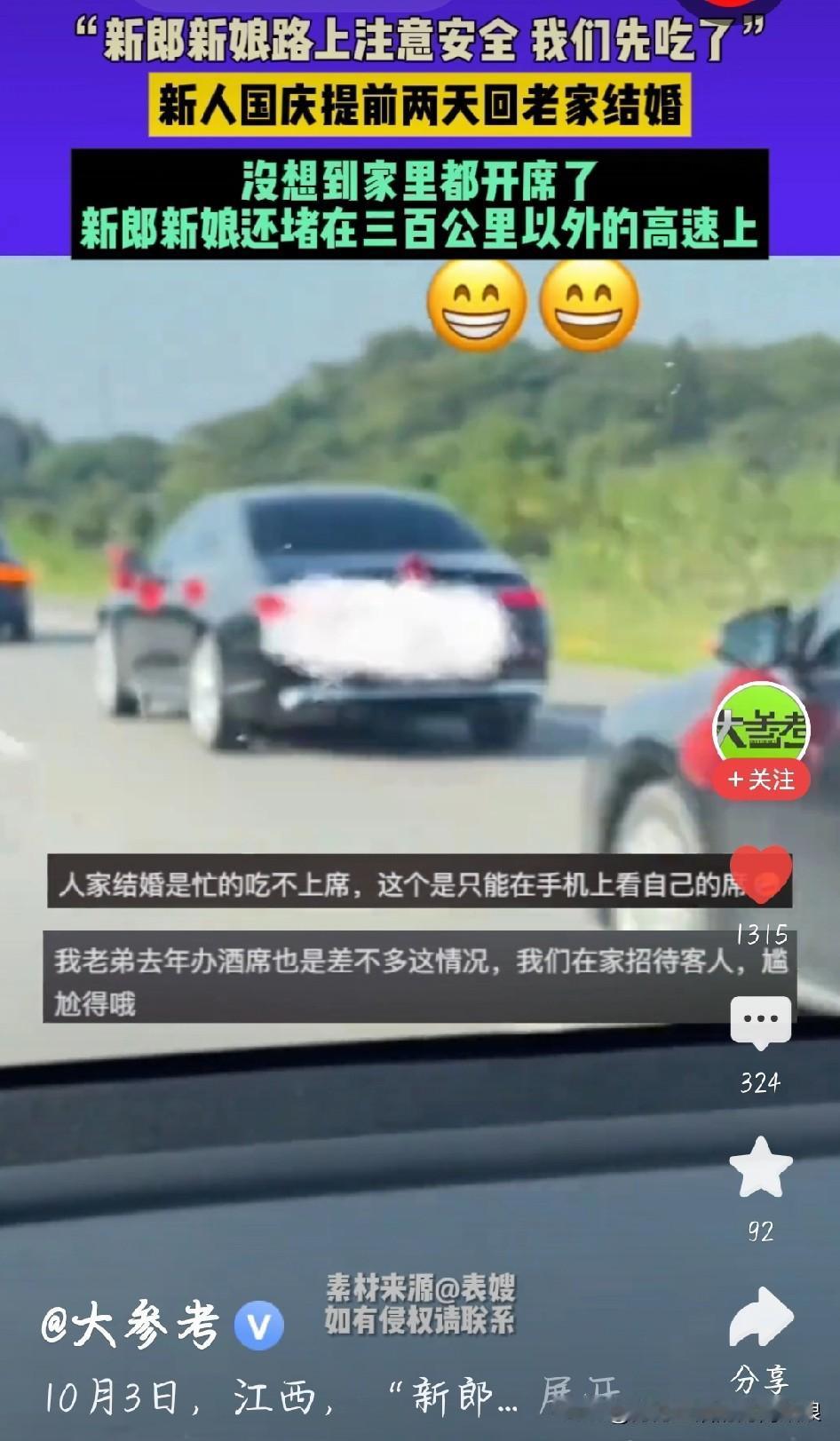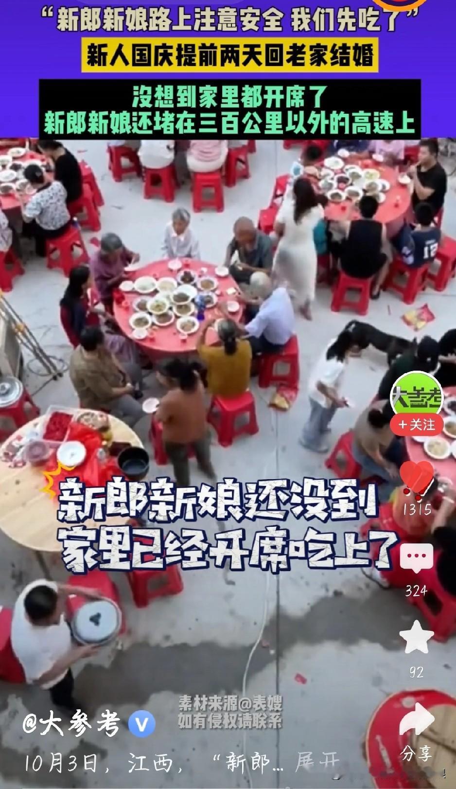 国庆结婚的这对新人太惨了!提前两天出发回老家办酒,结果被堵在高速上,离家还有300多公里,自己的婚宴都赶不上了。 家里更逗,宾客到齐了,菜也凉透了,新郎爸妈一合计:不等了,开席!十几桌人吃得津津有味,新人只能在堵车队伍里刷现场视频,堪称“云吃自己的席”。 新郎说提前12小时就出发了,哪想到高速堵成停车场,新能源车充电还得排队,彻底耽误了事儿。 网友都乐了:这哪是结婚,是给国庆堵车添素材!不过爸妈和宾客是真实在,总不能让大家饿着等,这份体谅太接地气了!新郎新娘还堵在高速 家里先开席了 黄金周高速堵车 返乡人高速堵车 国庆高速现状 最堵高速 国庆节高速堵车 国庆节结婚 图片截图于网络