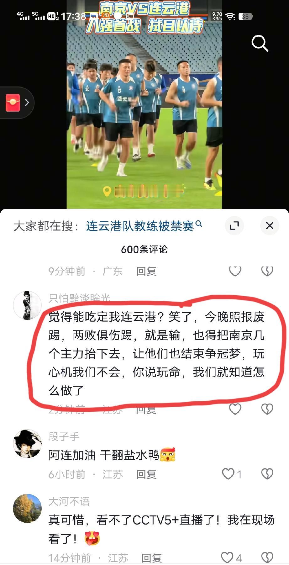 苏超第一场淘汰赛南京主场迎战连云港的比赛即将开打。赛前,有传言说连云港几个主力包