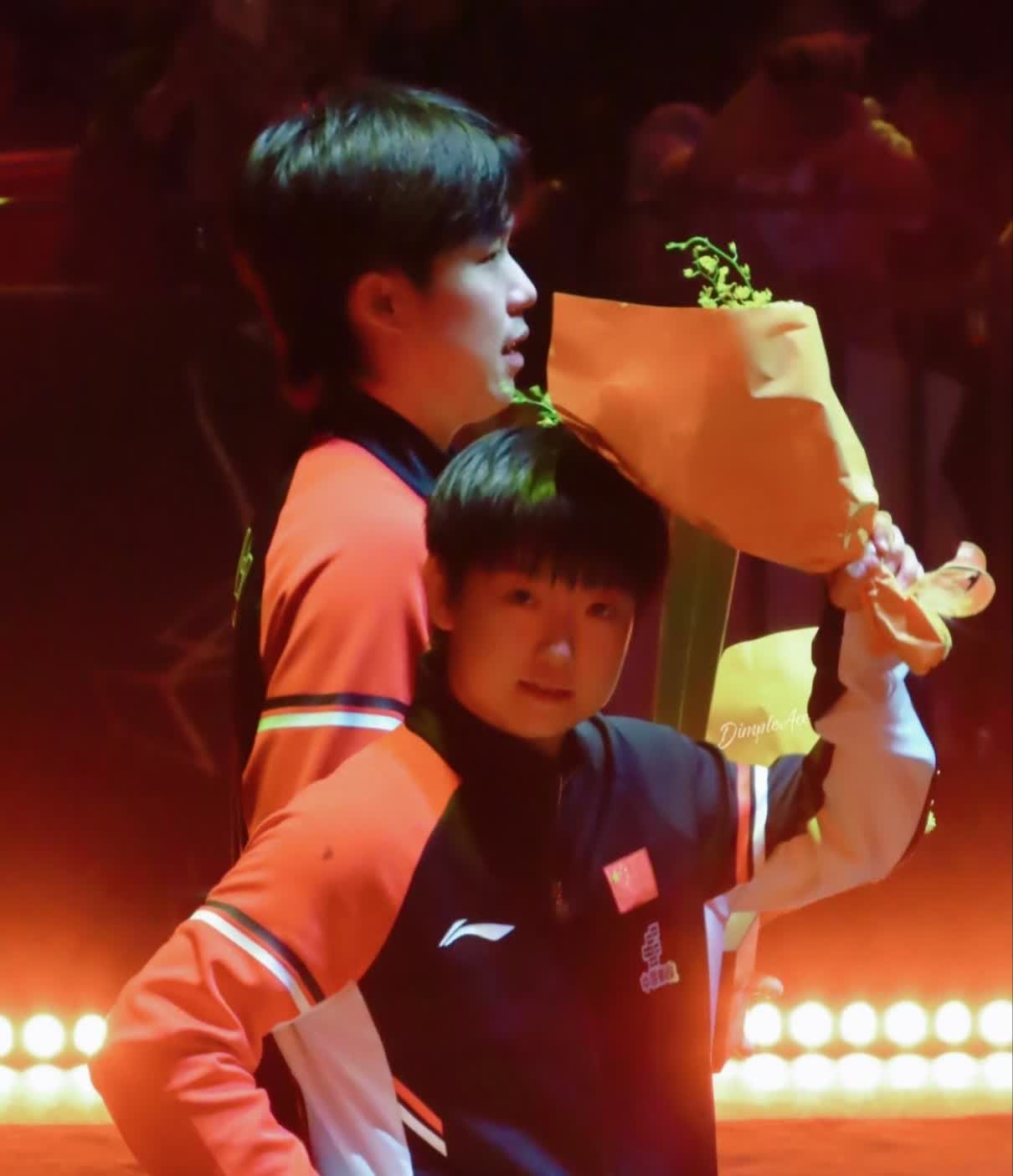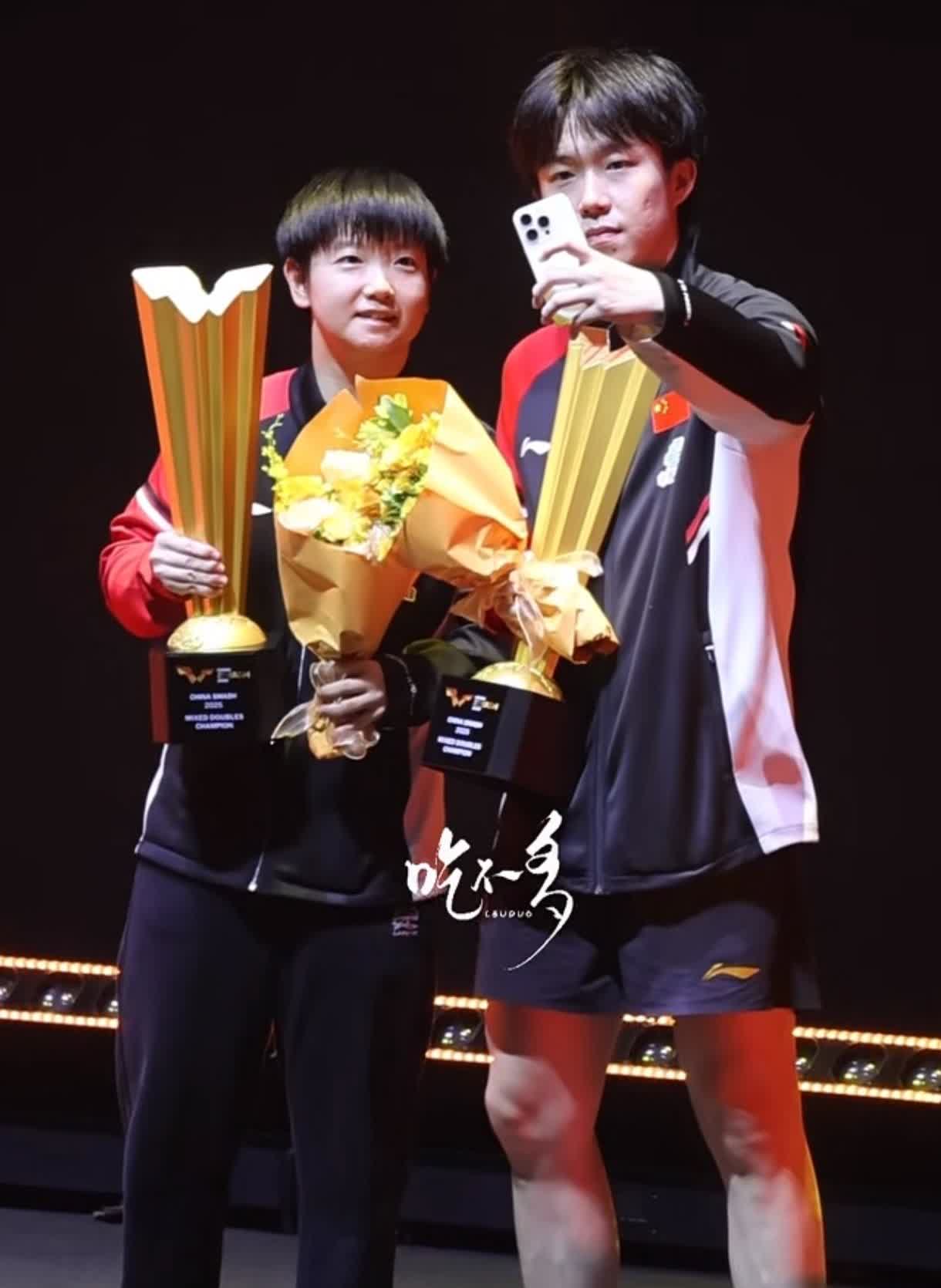 又是一个美好的夜晚,恭喜莎头组合又收获一个混双冠军。 这次北京大满贯的混双冠军奖杯又大又重,所以咱哥就自觉的拿上手机开始掌镜了,妹宝负责微笑就好。 咔嚓,又一张美好的混双合影自拍出片了!他俩永远都是,她在看镜头,而他在看她,甜的冒粉红色泡泡呐~ 哥还是那副暗爽模样儿,姐依然是可可爱爱的。此时此刻,我只想说一句:般配。