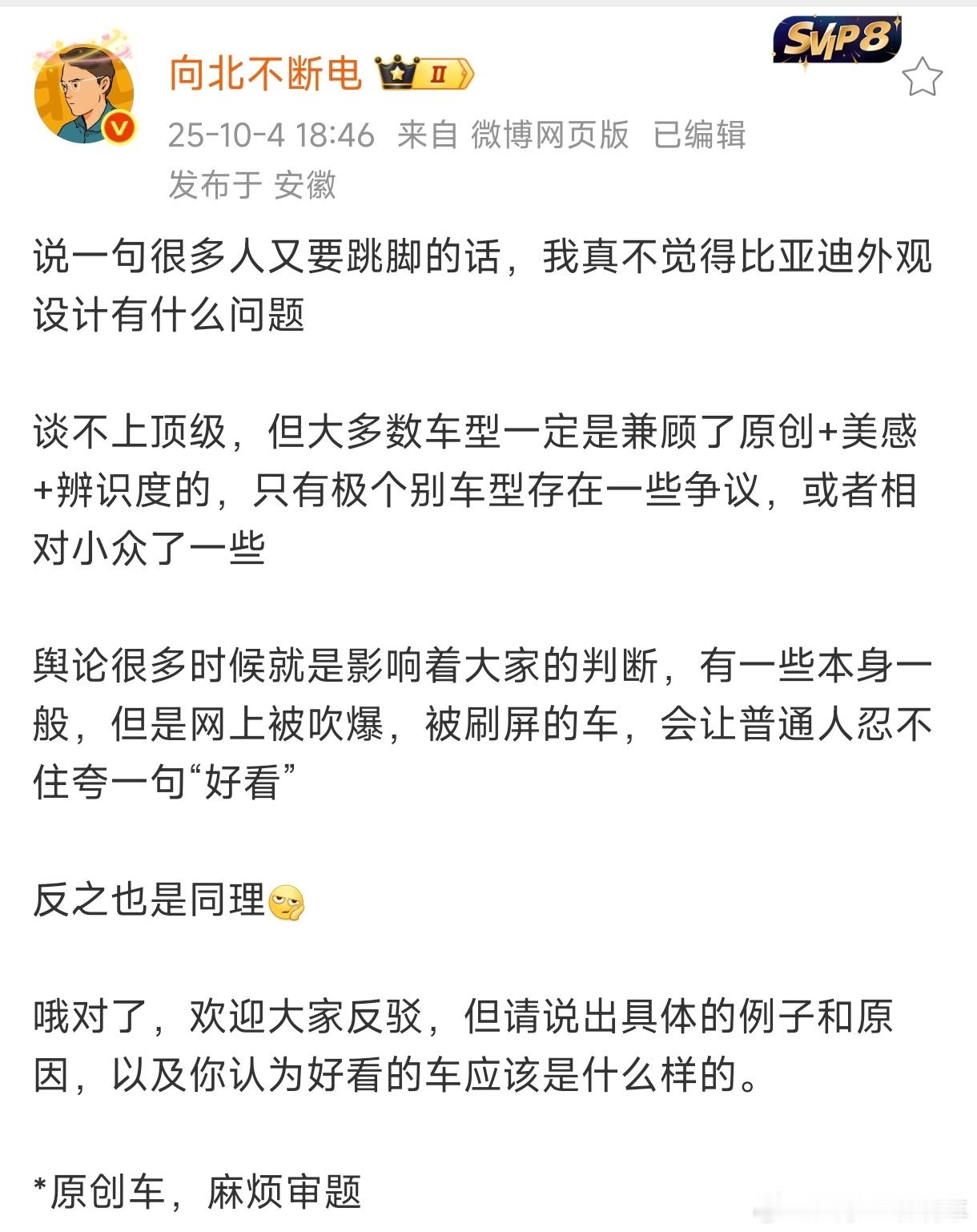 向北老师你问,哪些原创车是好看的,很简单,看看两年前比亚迪自己的车就好了。