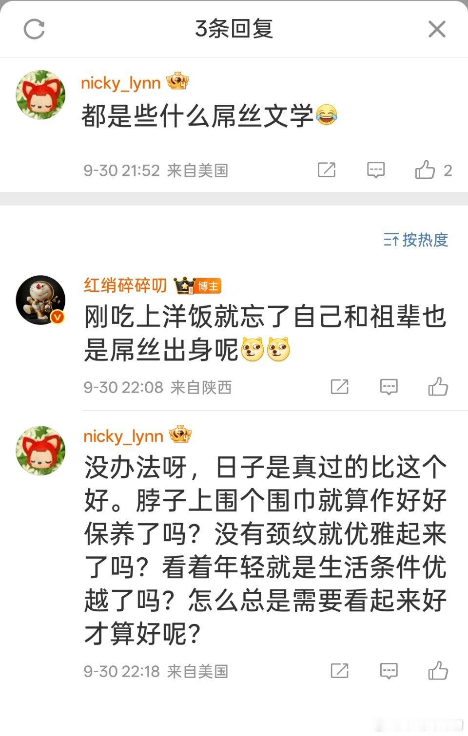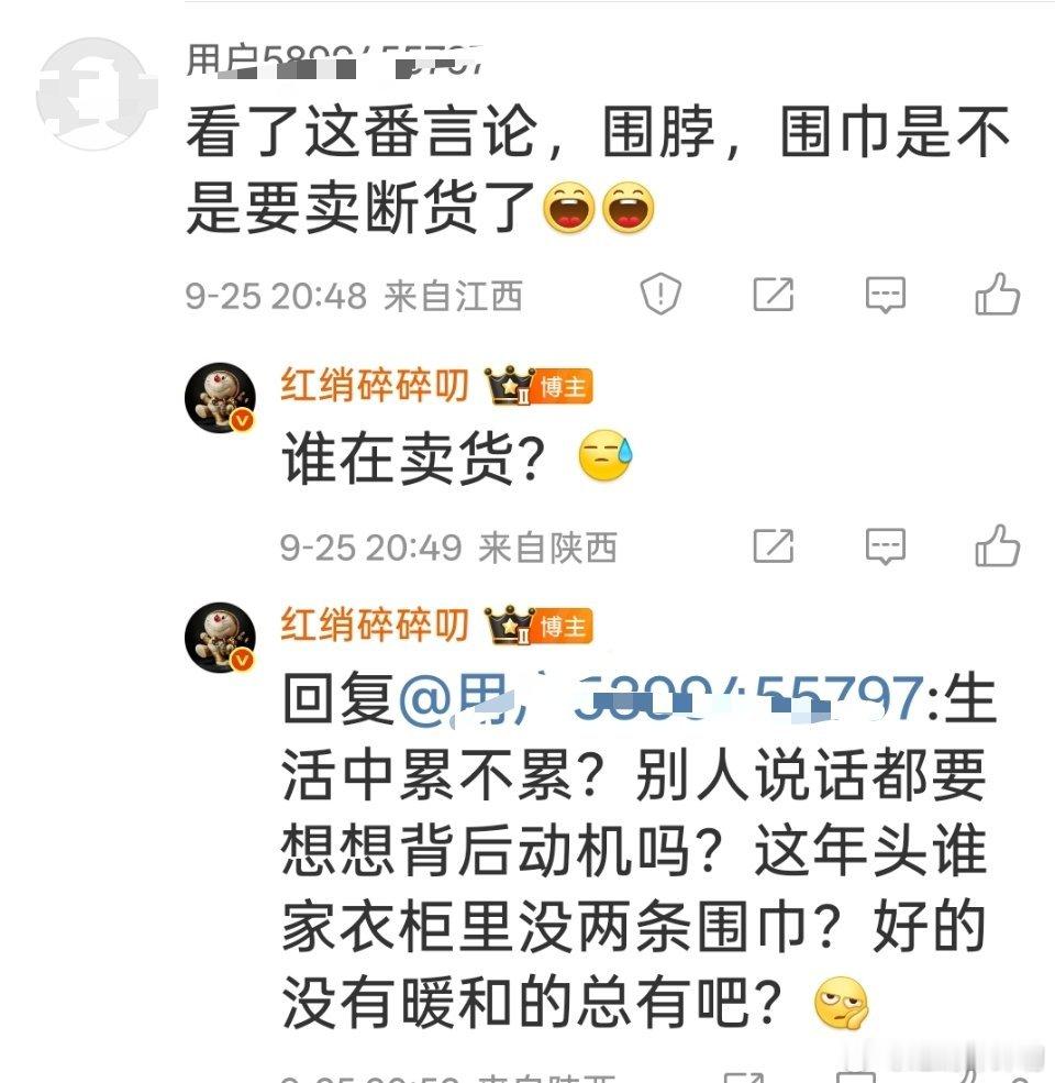 网上正常沟通也难啊![允悲][允悲][允悲]上次说了我小区一个阿姨常年带围巾,觉得这样可以缓解脖颈不舒服也可防晒避免颈纹加深的事,这么简单个事,没想到评论区还是有奇葩评论,尤其第一个,和六十多岁退休老奶比优越感的[二哈][二哈][二哈] ​​​