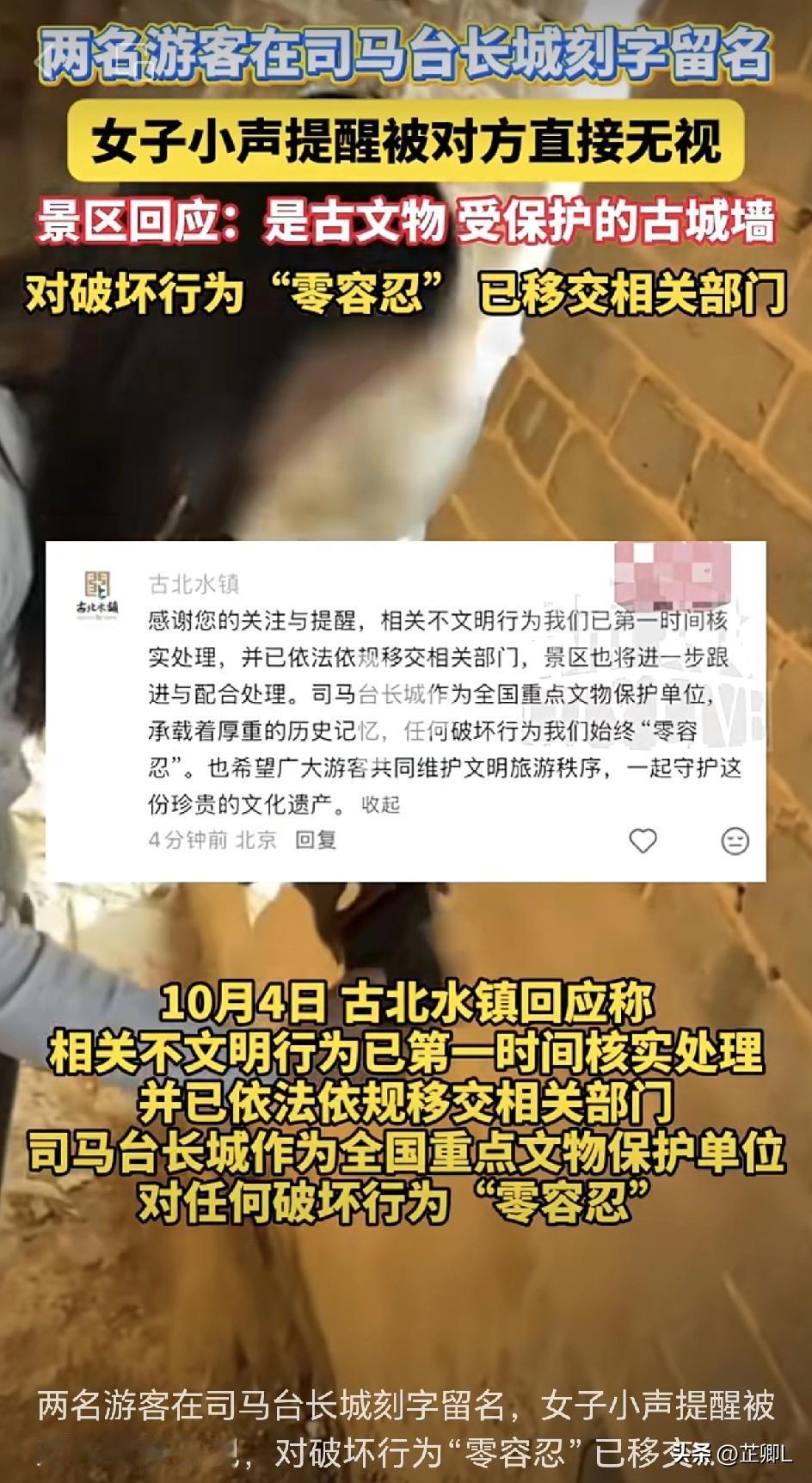 情侣长城刻字画心拍照留念, 冲上热搜!网友:这不是爱,是没素质! 10月4日,北京密云古北水镇景区,一对情侣在司马台长城墙上刻字,被一名女游客拍视频发布到网上引起网友们热议。 该名女游客在司马台长城烽火台游玩时,看到一名男子蹲着在长城墙上刻字,另外一名女子拿着手机笑嘻嘻地站在他的旁边。 女士好心提醒了一句“这不太好吧”,两人都未理会,仍然在城墙上继续刻字。 男子刻下两个人的名字还在中间画了个爱心后,女子拿出手机拍照留念。 司马台长城为明代修筑的长城段落,始建于明洪武初年(1373年),由戚继光、谭论于万历年间整修加固,2001年被列入第五批全国重点文物保护单位。 目前,事情已经交由警方开启调查,等待这对长城墙上秀恩爱的情侣的会是什么呢? 有几个以往的例子可以借鉴。 2021年3月21日,张某林、李某荣、苏某芳三人在八达岭景区游览时,在长城墙体上刻划损坏文物,警方对三人作出行政拘留并处罚款的处罚。 2023年,在八达岭长城,韩某茹不听劝阻,用发簪在城墙上刻字,警方对其予以行政拘留并处罚款处罚。 2025年10月4日的这对情侣,长城墙上秀恩爱,拘留罚款逃不脱。 不知道,经此一事,这对情侣还会不会情比金坚?是否因为这个污点从此分道扬镳? 那刻在古老长城上的名字和爱心,明晃晃地,极具讽刺! 别说不能在文物上刻字,就是普通的建筑物,也不能随意刻画损伤。 不是把名字刻在一起,就能证明爱的忠贞不渝。不是画上一颗爱心,就能代表浪漫的爱情。 他们秀的不是恩爱,不是浪漫,而是把自己那一点不高的素质摆到了大众眼前,接受所有人的唾弃。 无知者无畏,知而深深畏! 信息来源于都市现场,侵联删!
