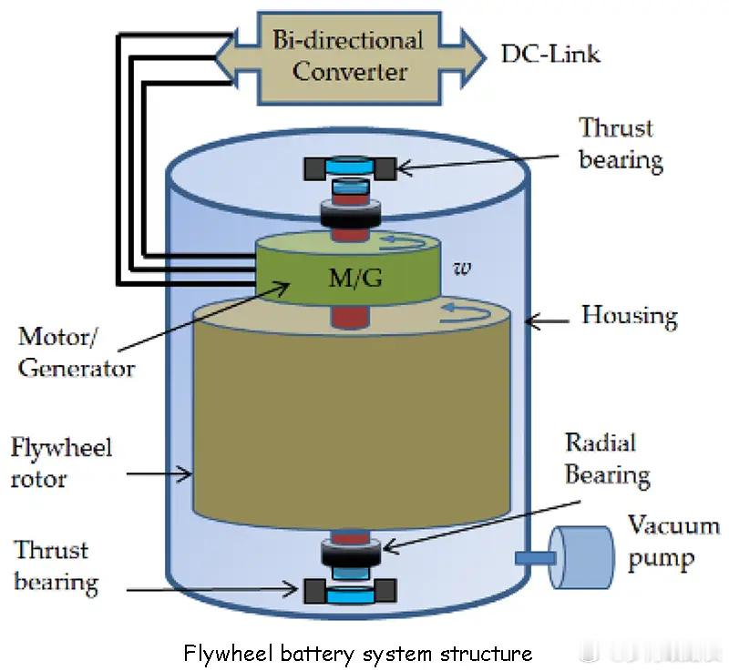 飞轮电池简单科普,飞轮本体+轴承+双向电机+电力转换器+真空室5个主要组件构成: