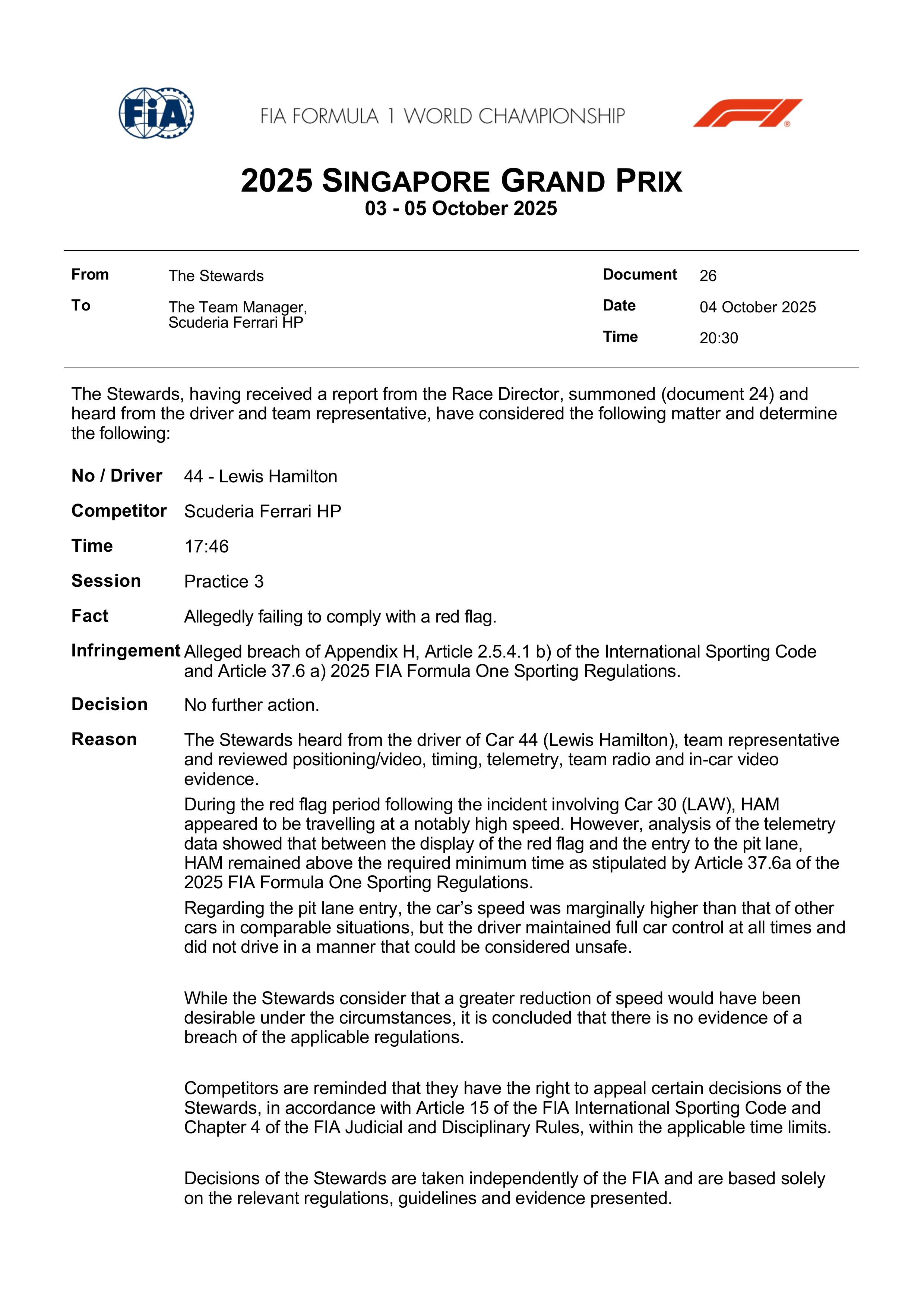 汉密尔顿在红旗后始终没有超过Delta时间,虽然赛会仲裁们认为在这些情况下,原本可以适当减速,但最终结论是没有证据表明汉密尔顿违反了规则。
