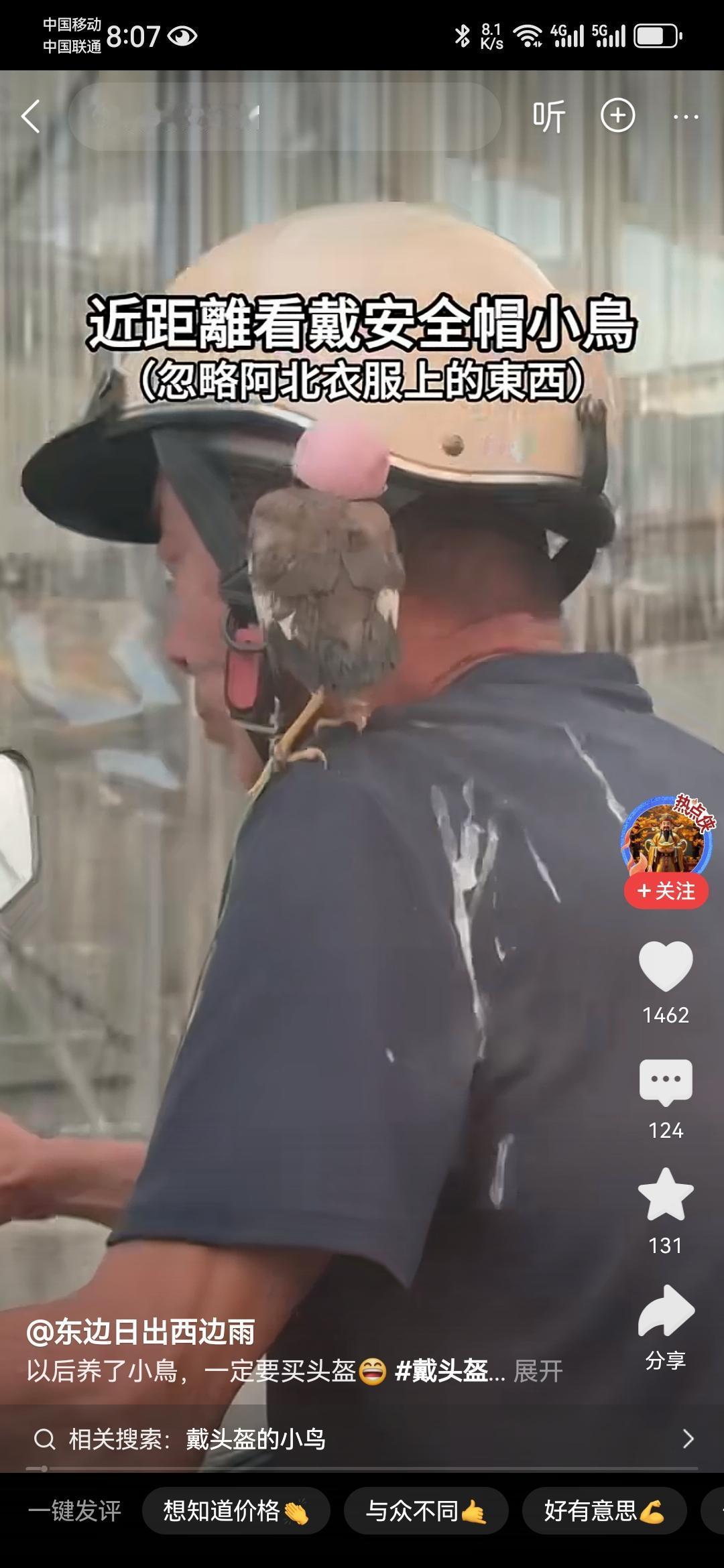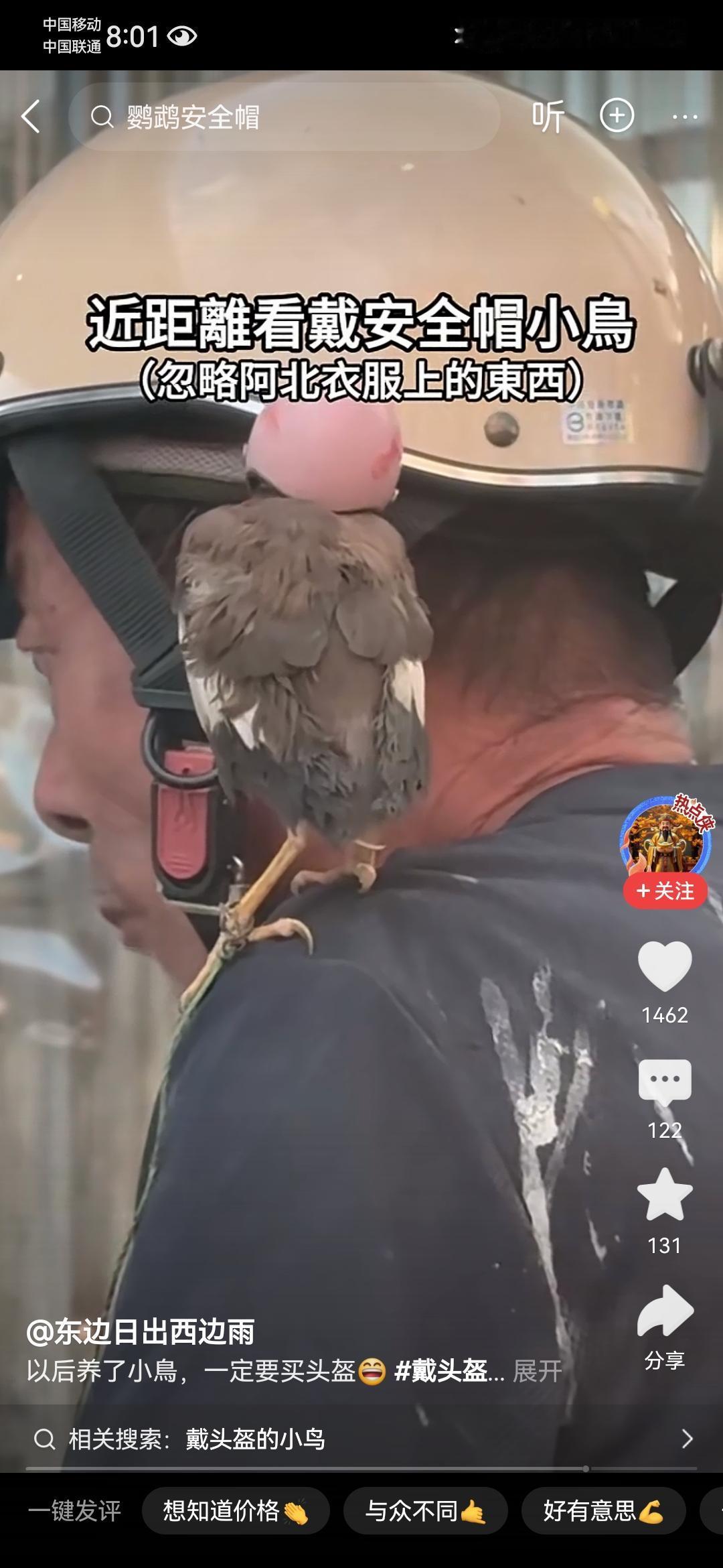 大爷是个讲究人,安全意识到位了。肩膀上的小鸟戴着个粉丝的头盔,交警叔叔看到了估计也没话说的吧!我就好奇了,这头盔是专门定制的呢?还是哪里可以买的到。 看起来这头盔还是有模有样的,搞得我都想整一只小鸟,也学做一个像这个位大爷一样有趣的小老头?拉风,实在是拉风! 有网友说:头盔都有了,再给它整个尿不湿不过分吧? 你觉得可以有吗?