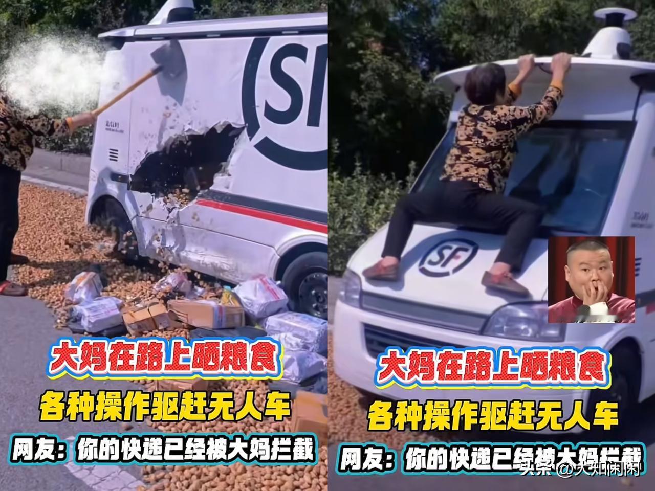 无人驾驶车压了乡下大妈晒的花生,大妈喊半天没人下车,一怒之下拿铁锤砸车。 车