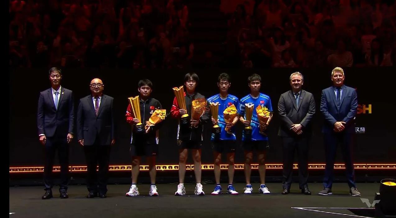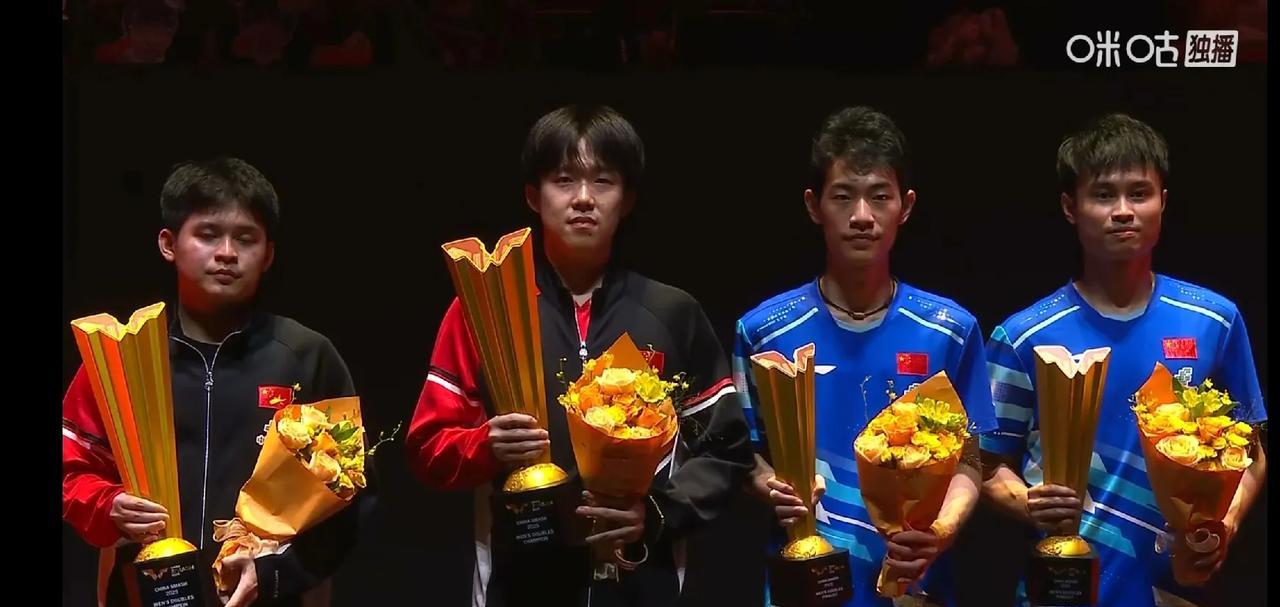 乒协主席王励勤给WTT中国大满贯男双冠军林诗栋/王楚钦颁发鲜花。冠军自拍环节,王楚钦让林诗栋掌拍林诗栋让王楚钦帮忙拿鲜花。在头哥的带领下,林诗栋以后会拿很多的双打冠军奖杯的。今天小石头失误还是有点多。 陈俊菘和周启豪第二次配双打,一路力克众多强手,非常不错!本届比赛,陈俊菘男单从资格赛连胜6场闯进八强,而双打打进决赛,全面性得到展现,显示不俗的实力。