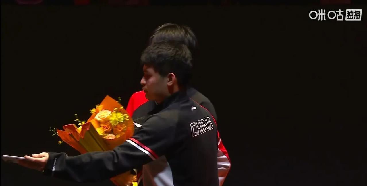乒协主席王励勤给WTT中国大满贯男双冠军林诗栋/王楚钦颁发鲜花。冠军自拍环节,王