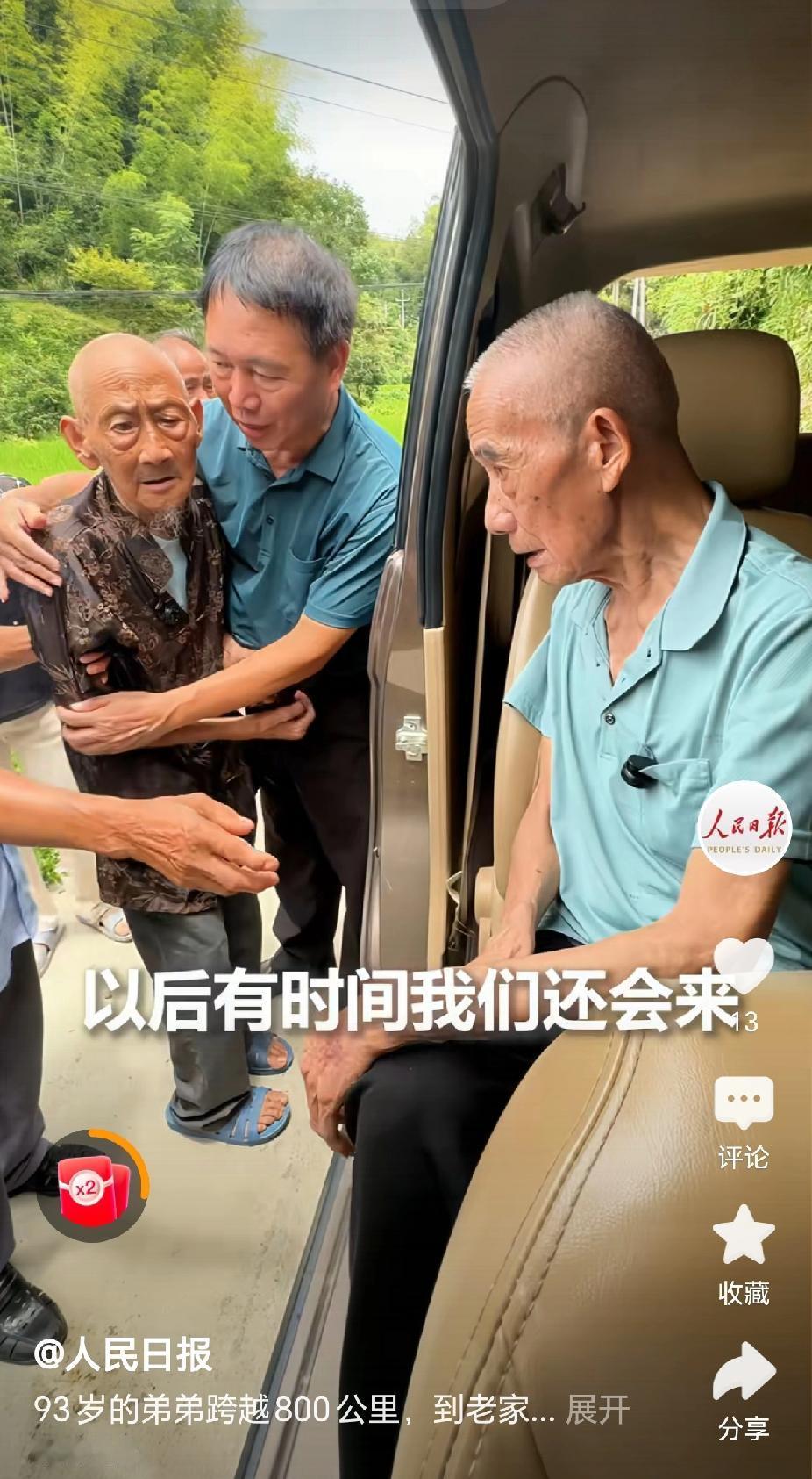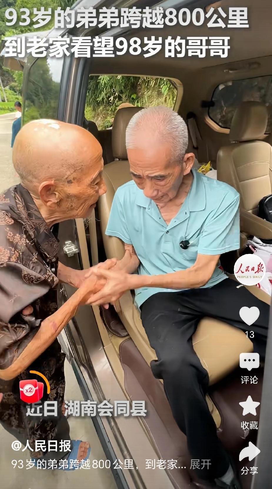“看哭了,93岁的弟弟前往看望98岁的哥哥!”近日,湖南会同,老人家98岁了,迎来了城里多年没见93岁的弟弟前来看望,相见泪汪汪,离别舍不得别!(来源:人民日报) 据视频报道,哥哥今年98岁了,一直生活在会同老家的山区,条件还比较艰苦。弟弟今年也是93岁的高龄了,早年出去干革命参加了工作。 兄弟俩多年没有见面,最近弟弟得知兄长还健在,就让孙子租了1台车子,不顾自己93岁的高龄,从省城驱车800公里前往乡下看望已是98岁弟弟! 兄弟相见的那一刹那,双方双手紧紧的握在一起,相互诉说着几十年离别的情况,真的是难舍难分。哥哥的生活条件还比较艰难,在农村,虽然也是儿孙满堂,但脚上仍穿着拖鞋! “以后有时间我们还会再来!”弟弟面对哥哥说,等你100岁的时候,我们还要相聚! “我们都要活过100岁,你100岁的时候我也要来看你!”哥哥也做出承诺。 在离开的刹那,弟弟掩面而泣,眼角泛红。哥哥也是非常的不舍,两位兄弟,期待着下一次相逢。 “两位90多岁高龄的兄弟能够在余生相重逢,这也是值得庆祝的事情!”有网友评论说,不管是参加了工作的弟弟,还是仍在乡下的哥哥,都是幸运的人! “这是大山阻隔不断的亲情!”有网友评论说,不管岁月如何蹉跎,不管路程多么漫长,当阻隔不了兄弟相见的情谊! 是呀,这份兄弟之情得到了人民日报的转发点赞,大家都祝愿两位老人家长命百岁!身体健康! 对此,你的看法是怎样的呢? 高龄兄弟相见 @秋实99 关注人生冷暖,拥抱幸福生活!