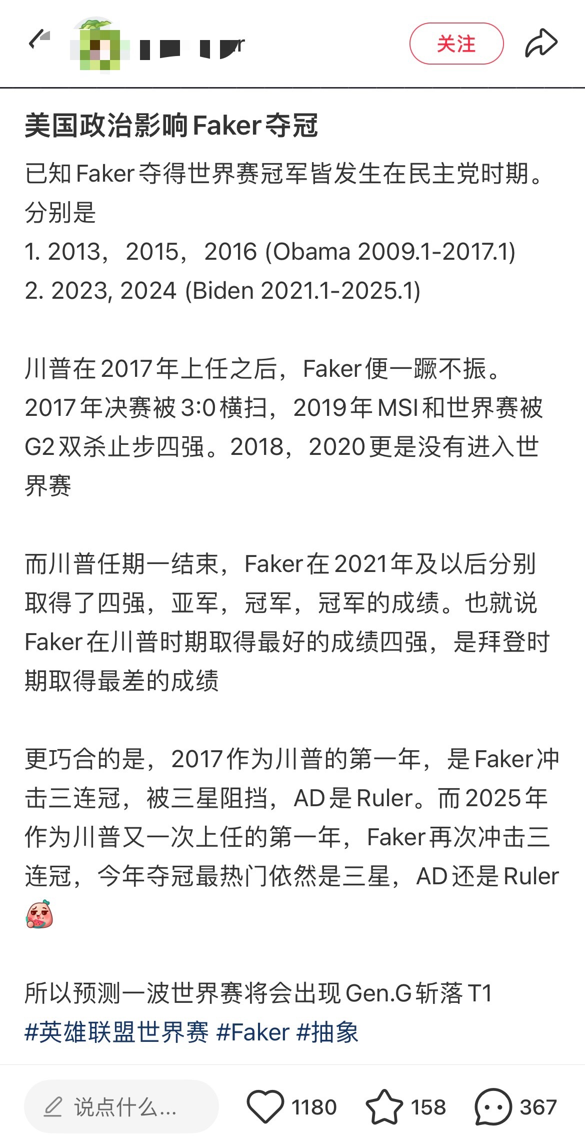 川普在2017年上任之后,Faker便一蹶不振。2017年决赛被3:0横扫,2019年MSI和世界赛被G2双杀止步四强。2018,2020更是没有进入世界赛