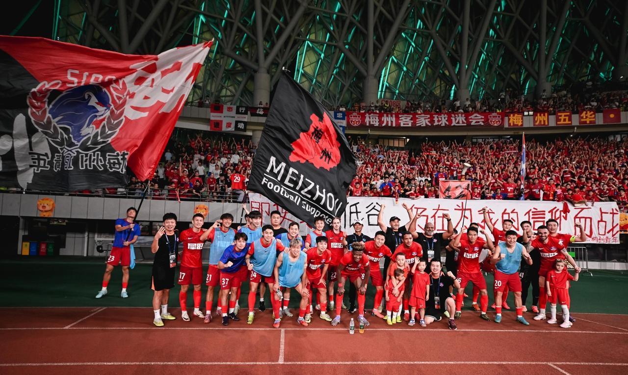 主场击败青岛海牛后,梅州客家全体将士留下了这样欢快的合影。球队在悬崖边上又被拉回
