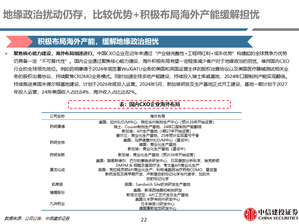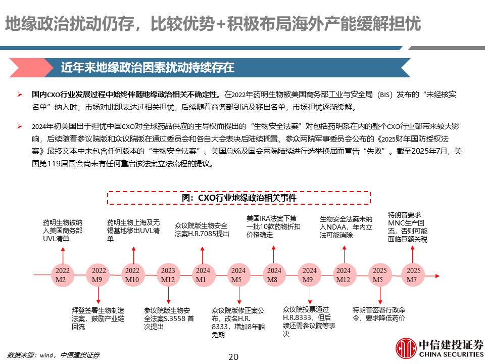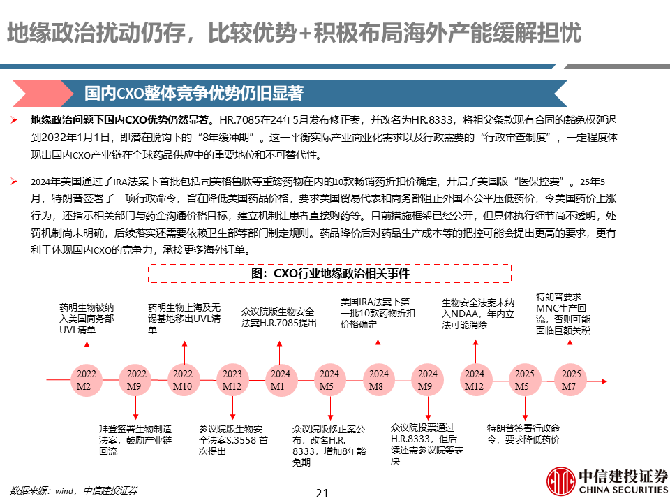 地缘政治影响逐渐减弱,创新药全球化趋势明确。24年年初美国“生物安全法案”的提出对整个CXO行业的发展带来较大担忧,后续随着“祖父条款”的添加、议程推进的缓慢以及最终版“NDAA”未纳入,体现出国内企业的强大竞争力以及比较优势。随着国内创新药出海趋势的进一步明确,CXO下游需求有望持续提升。