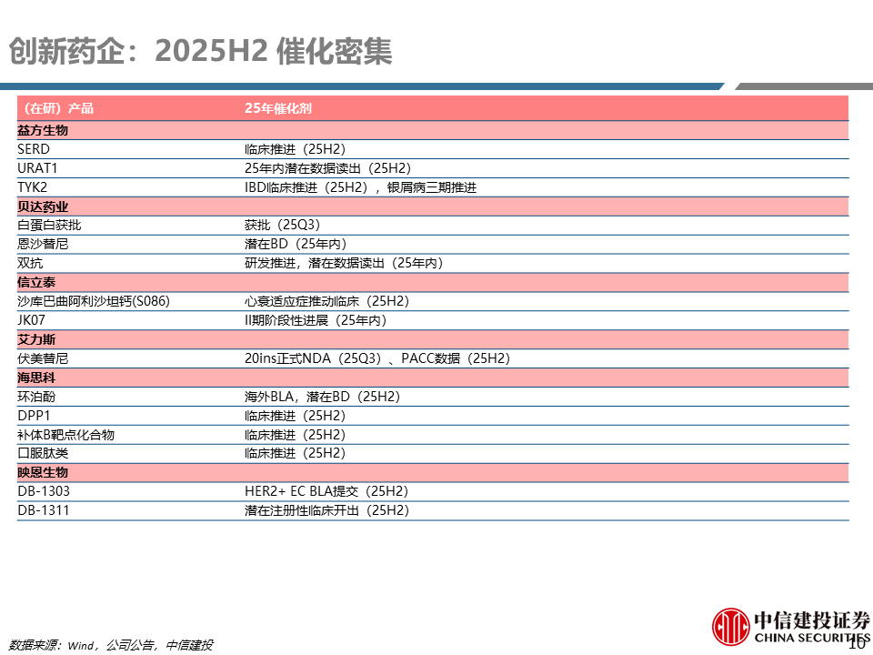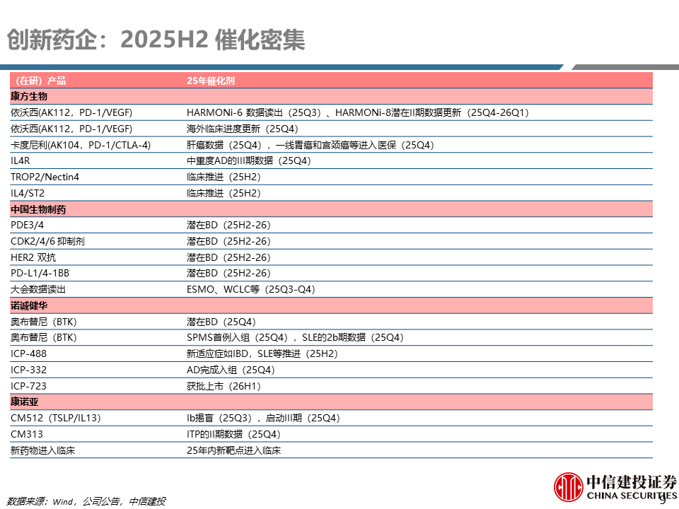 预计中国出海BD持续蓬勃。25H2重点关注肿瘤领域的PD-1/VEGF,PD-1/IL2,EGFRADC,DLL3ADC,DLL3/DLL3/CD3,代谢领域的GLP-1,ActIIR,Amylin,免疫领域的TSLP、TYK2、TCE、PDE3/4。2026年及后续重点关注肿瘤领域的双抗ADC如EGFR/Her3ADC,EGFR/c-metADC、多抗TCE如GPRC5D/BCMA/CD3,代谢领域的GGG+X,免疫领域的TCE、TL1A、IRAK4protac、TSLP、多抗等。