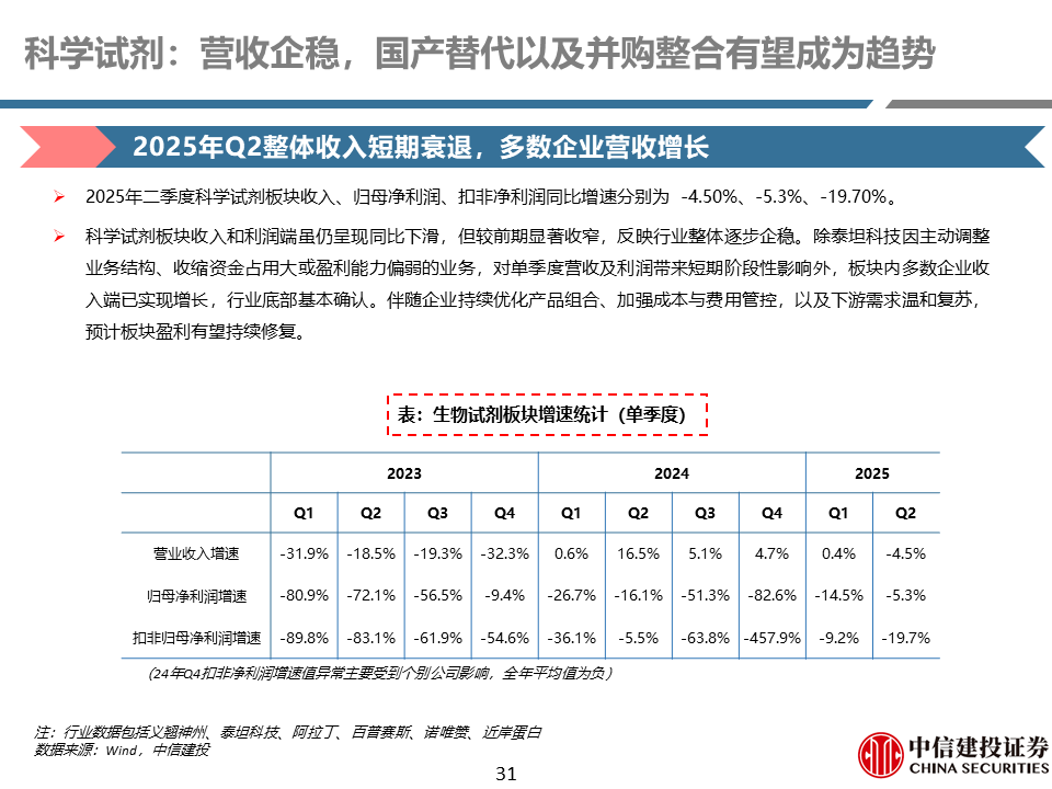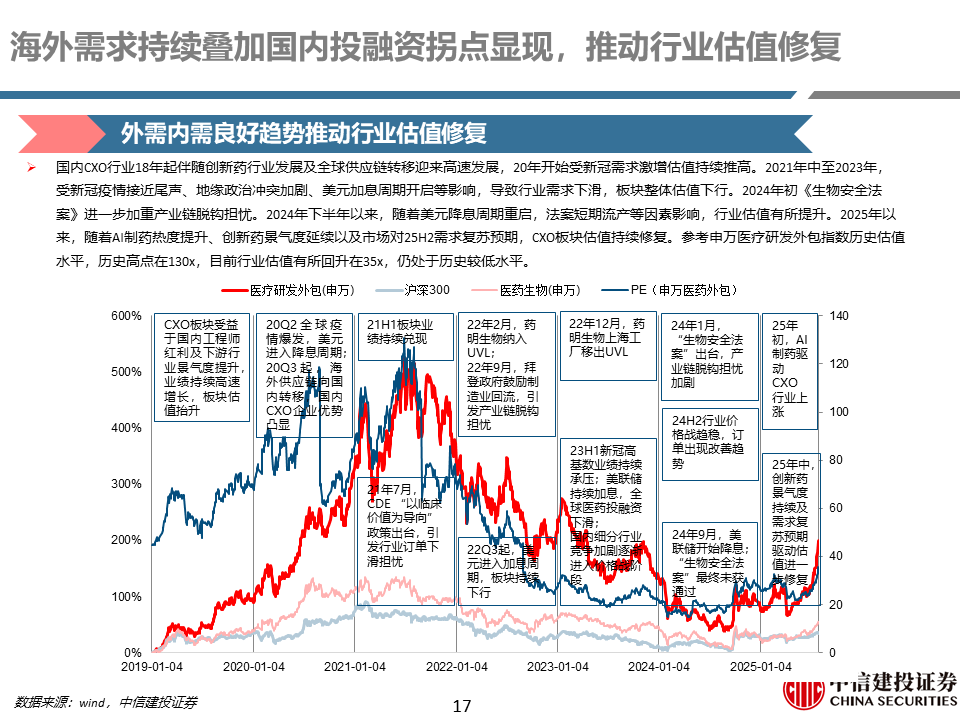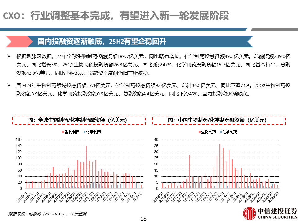 外需持续增长叠加内需拐点显现,推动行业估值修复。全球医药领域投融资23年底出现复苏趋势,24年整体保持稳健,国内头部企业订单端持续恢复,25年预计逐渐传导到业绩端。国内投融资25H1逐渐触底,25H2有望迎来复苏,叠加国内创新药行业持续的BD预期以及IPO逐渐活跃,内需外需共振下有望推动行业持续估值修复。
