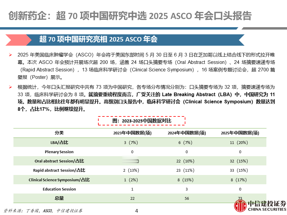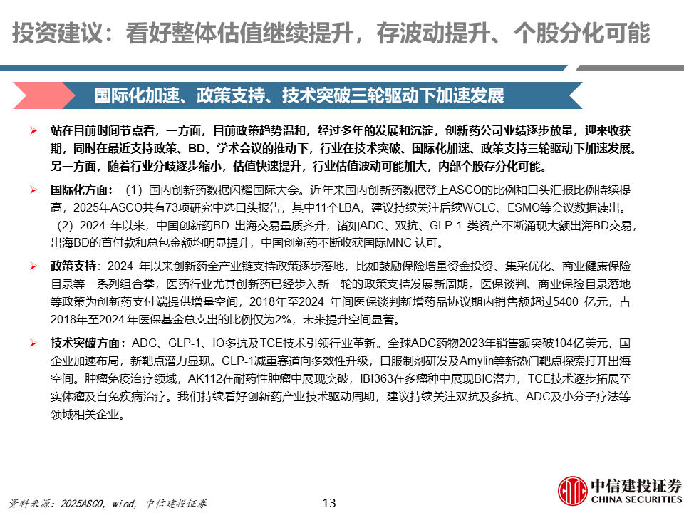 国际化方面:(1)国内创新药数据闪耀国际大会。近年来国内创新药数据登上ASCO的比例和口头汇报比例持续提高,2025年ASCO共有73项研究中选口头报告,其中11个LBA,建议持续关注后续EHA、ADA、ESMO等会议国内创新药数据读出。(2)2024年以来,中国创新药BD出海交易量质齐升,诸如ADC、双抗、GLP-1类资产不断涌现大额出海BD交易,出海BD的首付款和总包金额均明显提升,表明中国创新药不断收获国际MNC认可。