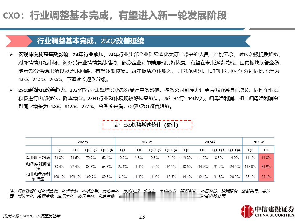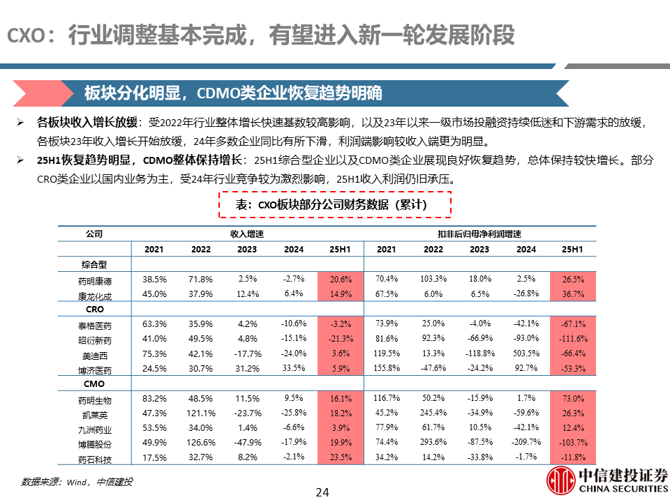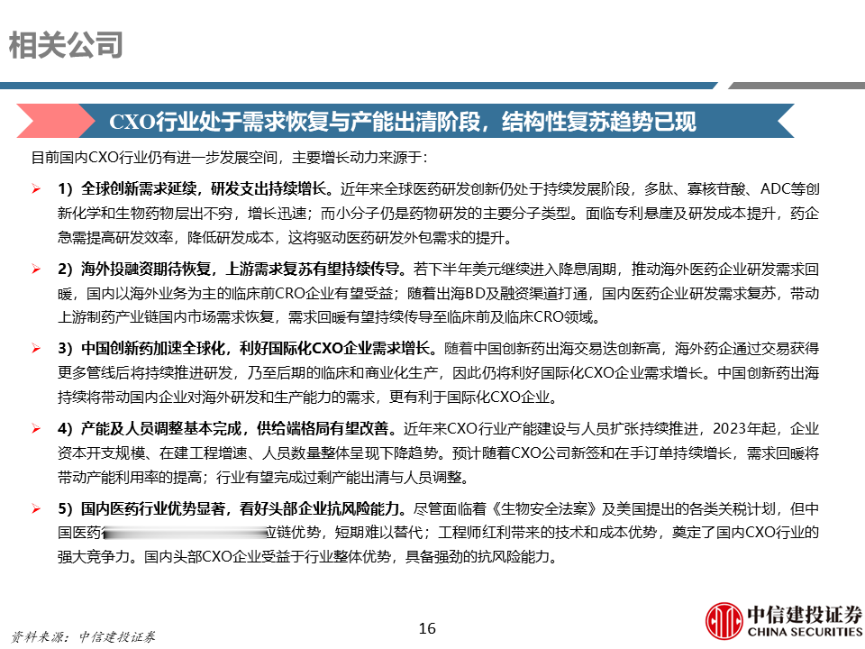 CXO行业23-24年调整较为充分,目前全球投融资恢复有望推动全球客户需求逐步回暖,国内创新药高景气度有望带来国内需求逐渐复苏,外需持续叠加内需向上有望带动行业进入新一轮发展阶段。