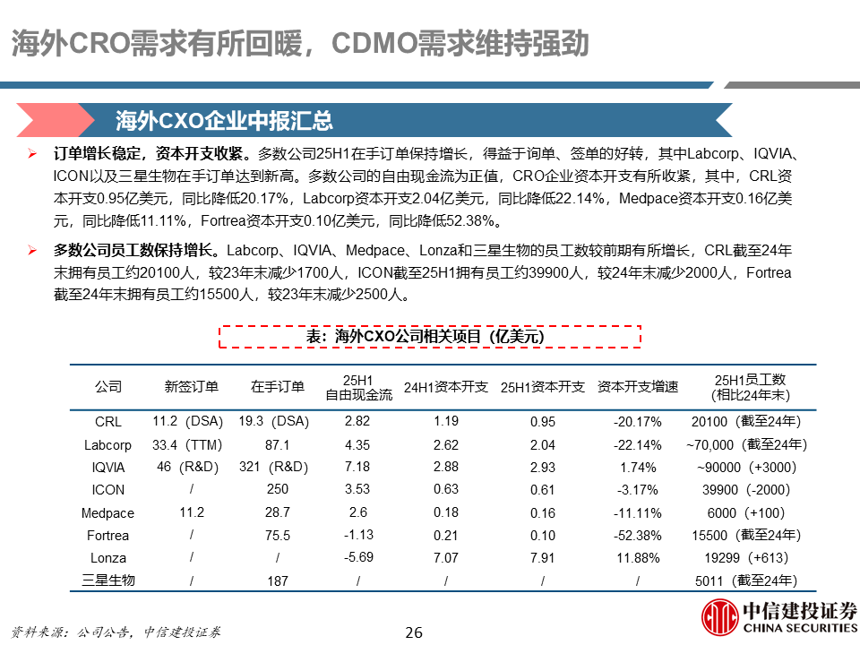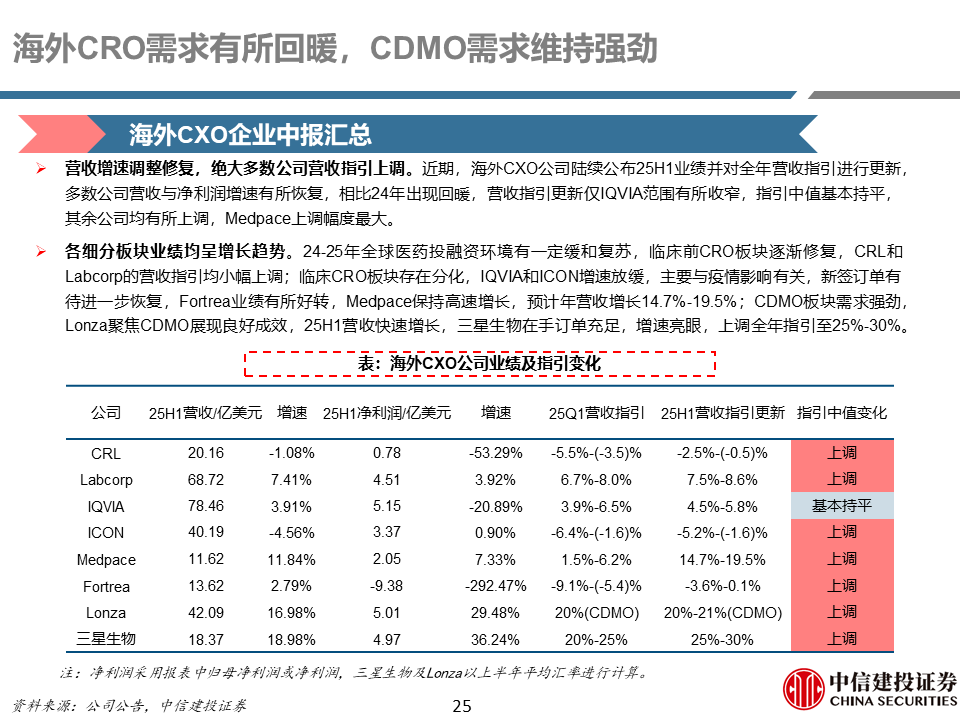 海外CRO需求有所回暖,CDMO需求维持强劲。24-25年全球医药投融资环境有一定缓和复苏,临床前CRO板块逐渐修复,临床CRO板块存在分化,IQVIA和ICON增速放缓,Medpace保持高速增长,营收指引大幅上调;CDMO板块需求维持强劲,Lonza聚焦CDMO展现良好成效,营收保持快速增长,三星生物计划剥离生物类似药业务,同时上调全年营收指引。
