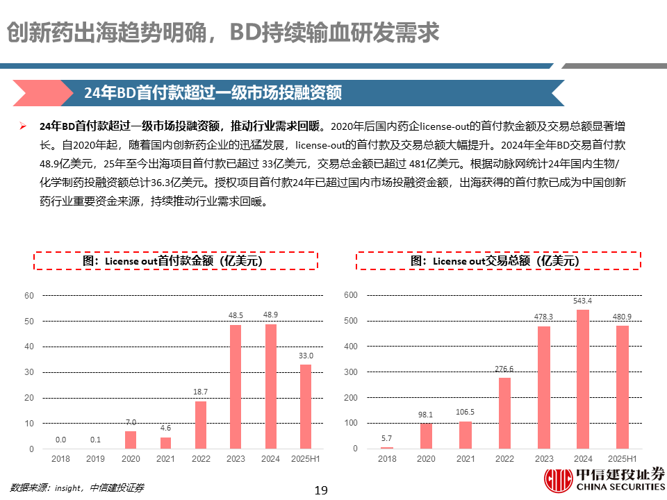 中国诸多创新药资产近年来逐步进入全球视野,临床数据在各类学术会议上占据越发重要的地位,BD授权金额及数量持续攀升,全球影响力持续扩大。伴随着临床数据的驱动以及持续强化的BD预期的催化,创新药板块在25H1迎来一轮估值的修复,越来越多中国资产的全球价值开始获得认同。我们认为随着中国创新药竞争力持续提升及被发现,将有更多BD交易达成,一批授出项目有望在未来2-3年看到在全球主要市场陆续上市,带动国内创新药企迎来全球化发展加速。