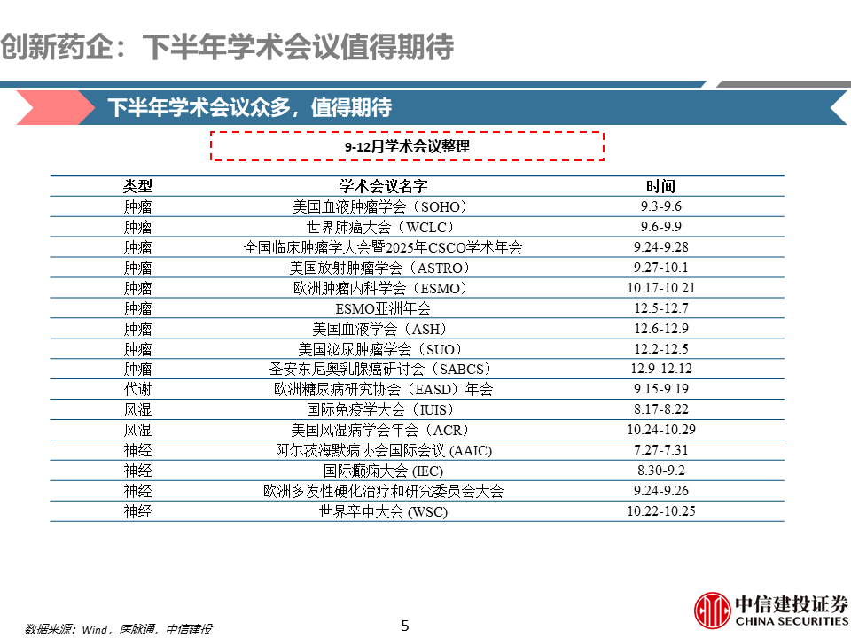 25H2行业关注度较高的部分行业大会,主要包括:ESMO消化道肿瘤大会(ESMOGI2025)7月2-5日;ESMO靶向抗癌治疗亚洲大会(ESMOTATAsia2025)7月18-20日;世界肺癌大会(WCLC2025)9月6-9日;欧洲临床肿瘤学会大会(ESMO2025)10月17-21日;ESMO亚洲大会(ESMOAsia2025)12月5-7日;美国血液学会(ASH)年会,12月6-9日;圣安东尼奥乳腺癌研讨会(SABCS2025)12月9-12日。