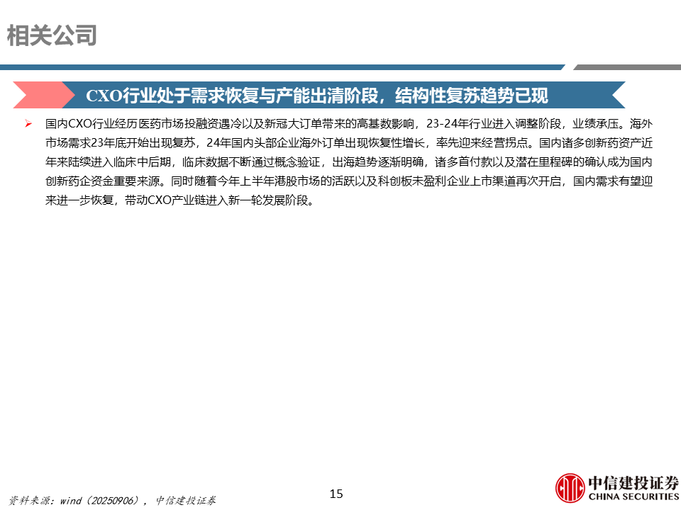 国内CXO行业经历医药市场投融资遇冷以及新冠大订单带来的高基数影响,23-24年行业进入调整阶段,业绩承压。海外市场需求23年底开始出现复苏,24年国内头部企业海外订单出现恢复性增长,率先迎来经营拐点。国内诸多创新药资产近年来陆续进入临床中后期,临床数据不断通过概念验证,出海趋势逐渐明确,诸多首付款以及潜在里程碑的确认成为国内创新药企资金重要来源。同时随着今年上半年港股市场的活跃以及科创板未盈利企业上市渠道再次开启,国内需求有望迎来进一步恢复,带动CXO产业链进入新一轮发展阶段。