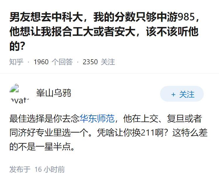 男友想去中科大,我的分数只够中游985,他想让我报合工大或者安大,该不该听他的?